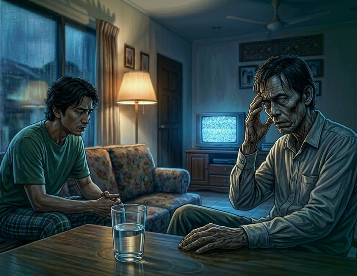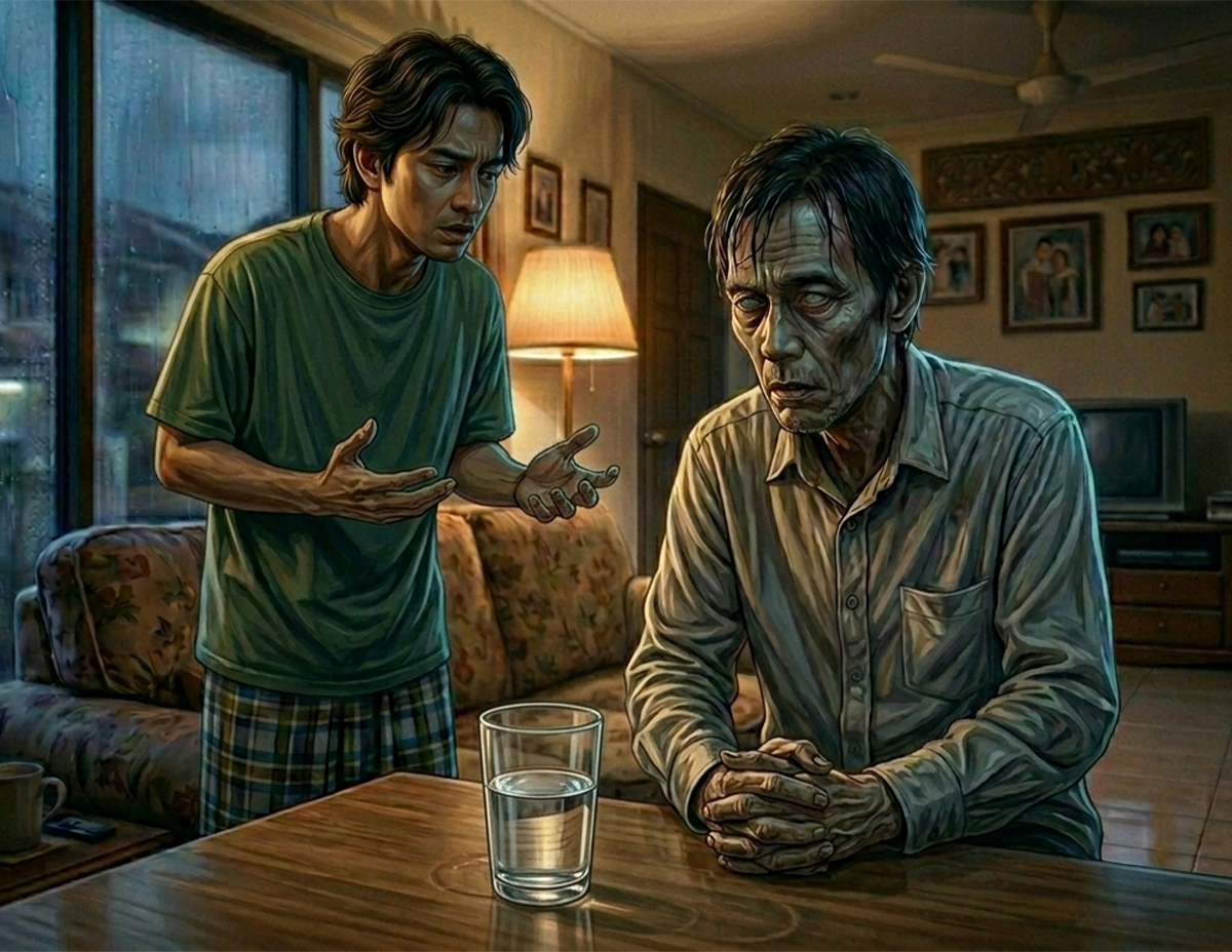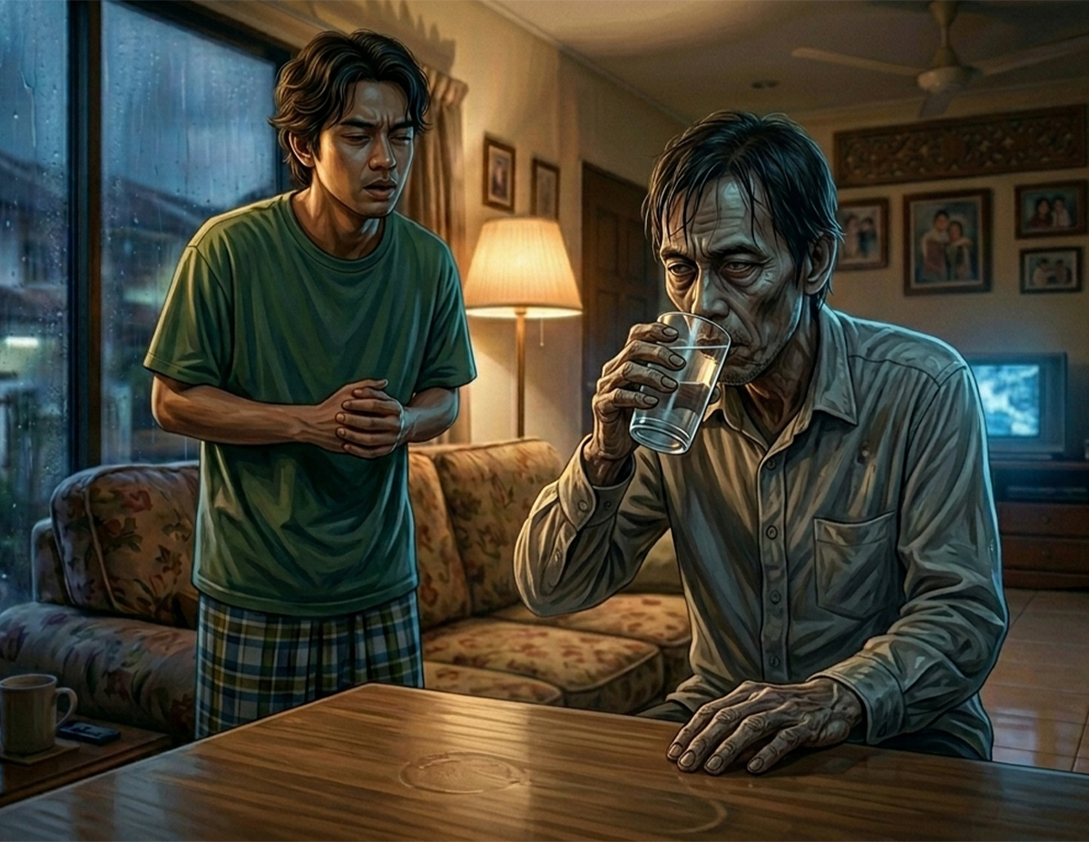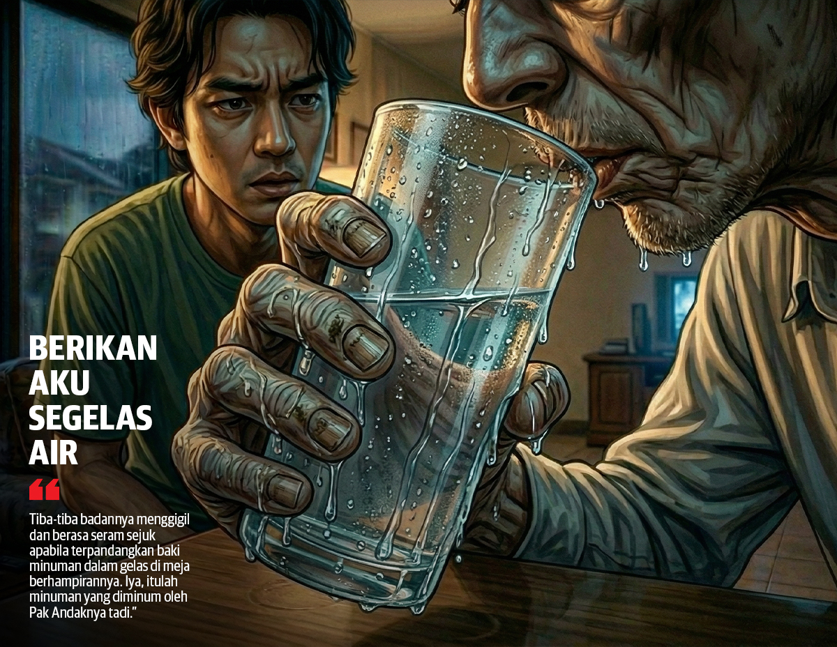 Tiba-tiba badannya menggigil dan berasa seram sejuk apabila terpandangkan baki minuman dalam gelas di meja berhampirannya. Iya, itulah minuman yang diminum oleh Pak Andaknya tadi.