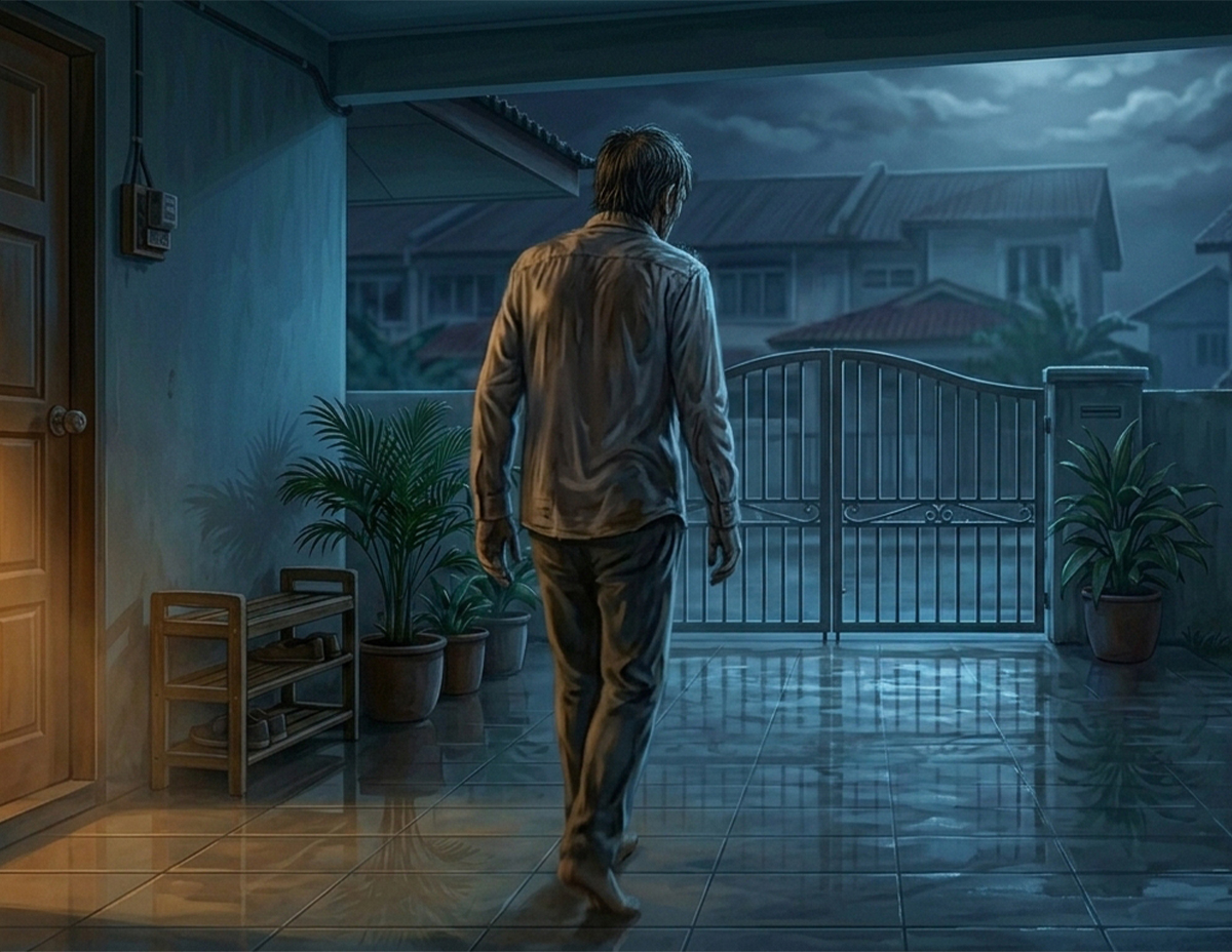 Belum pun sempat Solihin membuka mulut, lelaki tersebut sudah hilang di dalam gelap malam. Dia lantas mengambil gelas yang diberikan kepada lelaki itu sebelum meletakkan di dapur. Dan sebaik sahaja dia ingin menutup pintu, matanya terlihat cahaya lampu kenderaan menuju masuk ke pekarangan rumahnya.