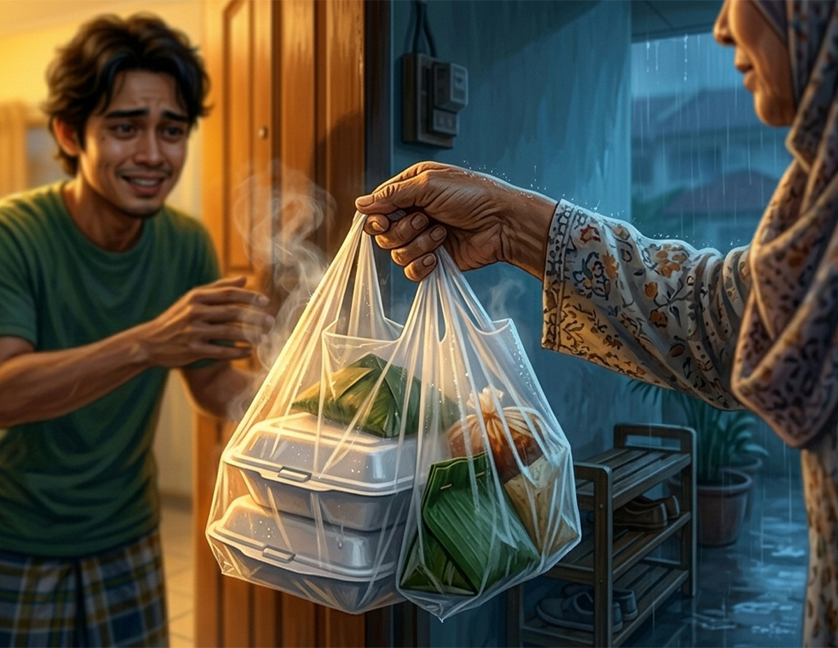 Solihin segera menyambut bungkusan makanan yang dijinjing ibunya. Setelah menutup pintu dia lantas meletakkan bungkusan makanan itu di atas meja.