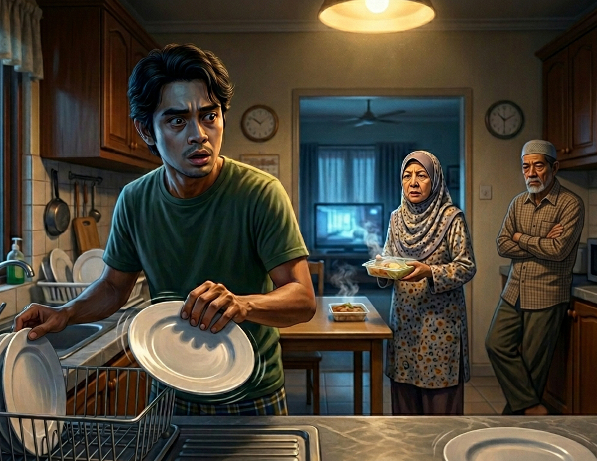 “Kenapa emak lama sangat di rumah Mak Teh?”, Tanya Solihin sambil mengambil pinggan kosong yang tersusun di rak berhampirannya.