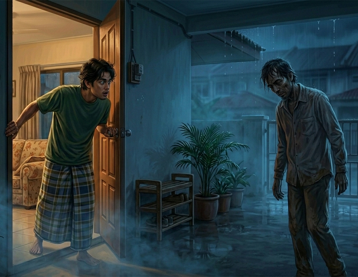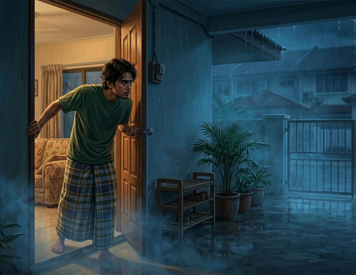 Mungkin mereka sudah balik agaknya, getusnya dalam hati. Sebaik sahaja pintu dibuka sekali lagi dia hairan. Seperti sebelumnya tidak nampak kelibat sesiapa pun di luar. Pelik! Tak mungkin dia salah dengar kerana bunyi ketukan tersebut cukup kuat sehingga mengejutkan lamunannya.