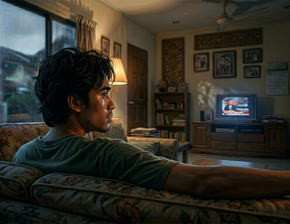 Mungkin perasaan aku saja agaknya, getusnya sambil mengunci pintu. Dia sambung duduk di sofa sambil matanya khusyuk melihat siaran rancangan di kaca TV.