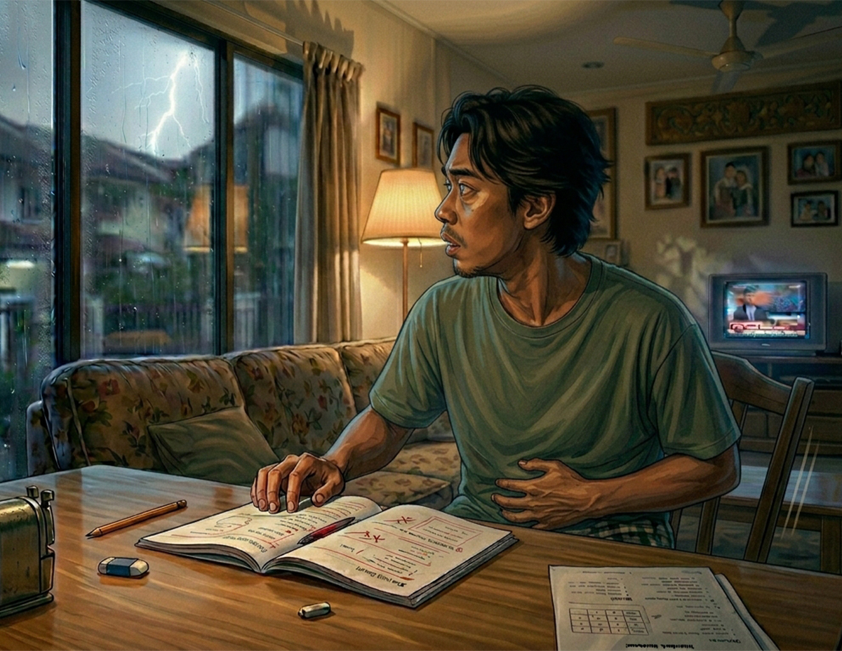 Dia toleh ke luar tingkap. Bunyi hujan lebat yang menimpa zink rumahnya bingit kedengaran. Lantas dia merapatkan tingkap yang sedikit terbuka untuk mengelakkan daripada tempias menerjah masuk.