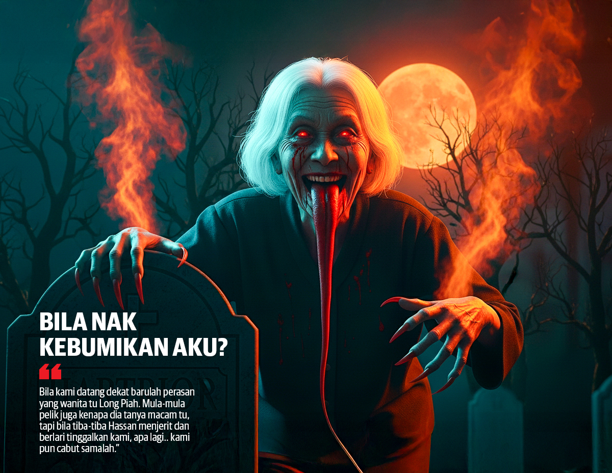 Bila kami datang dekat barulah perasan yang wanita tu Long Piah. Mula-mula pelik juga kenapa dia tanya macam tu, tapi bila tiba-tiba Hassan menjerit dan berlari tinggalkan kami, apa lagi.. kami pun cabut samalah,”