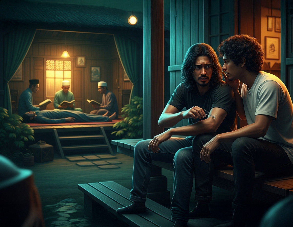 Jenazah Long Piah terbujur kaku di ruang tamu. Beberapa tetamu yang berada di situ khusyuk membaca surah Yasin dan ayat suci al-Quran. Sesekali Mali dan Kamal meninjau dari pangkin rumah berdekatan sambil menyapa beberapa penduduk kampung yang baru sampai.