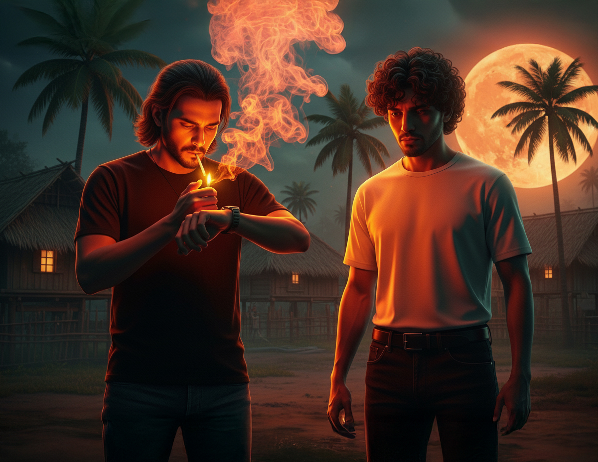 Lembayung merah jingga di kaki langit sudah bertukar gelap. Mali menoleh jam di tangan, sudah hampir 8 malam. Terus dia mengeluarkan sebatang rokok sambil menyalakannya. Kelihatan asapnya berkepul-kepul naik ke udara.”