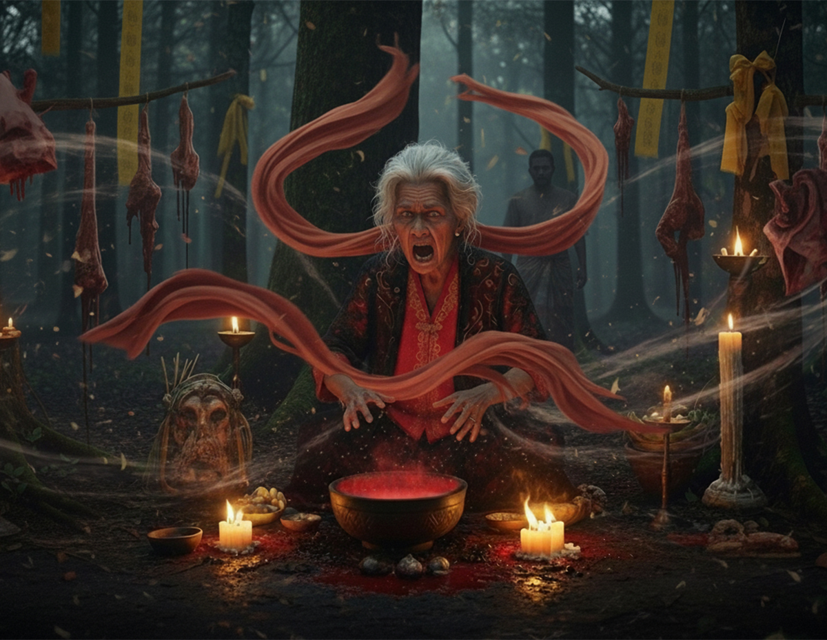 Upacara itu juga melibatkan darah yang banyak, dipercayai darah manusia. Din terus memaklumkan perkara itu kepada penduduk kampung khususnya pelanggan tetap Mak Jah.