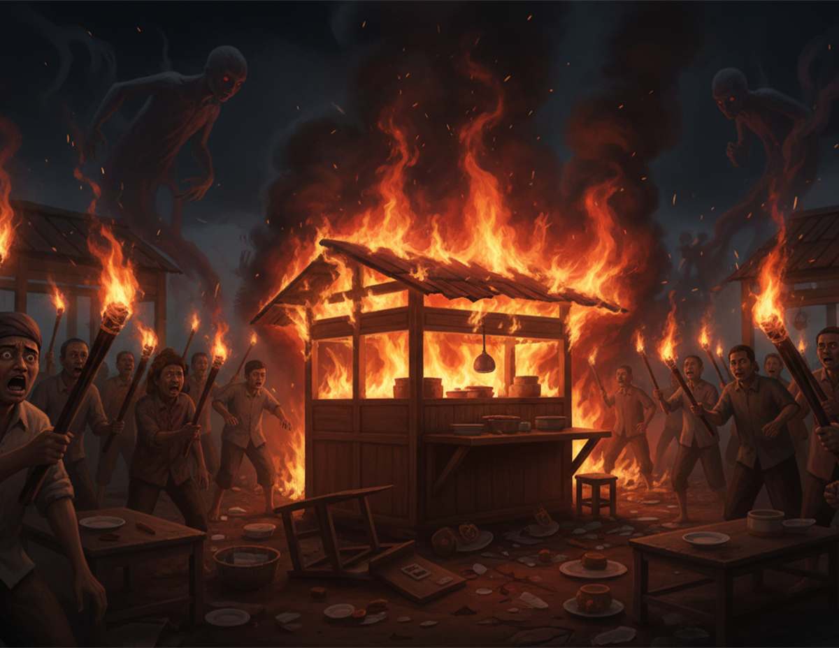 Akibatnya, kedai makan yang hanya dikenali sebagai warung Mak Jah itu dibakar oleh penduduk kampung kerana mengaitkan pemiliknya dengan ilmu hitam.