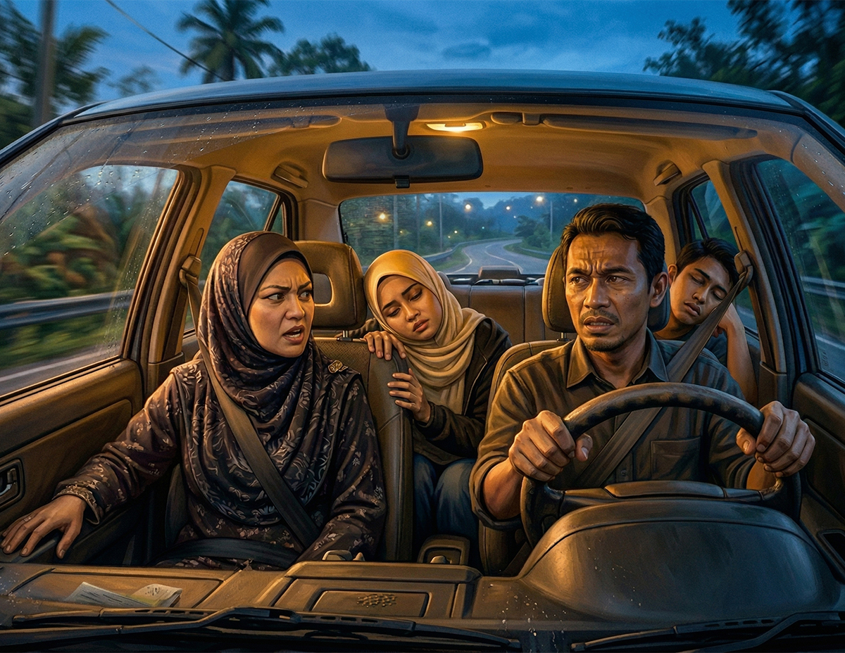 Azman hanya tersengih. Sesekali dia mengerling ke arah isterinya yang berada di sebelah. Sabar, sekejap lagi kita sampailah, jawab Azman perlahan sambil bola matanya melilau memandang ke luar tingkap.