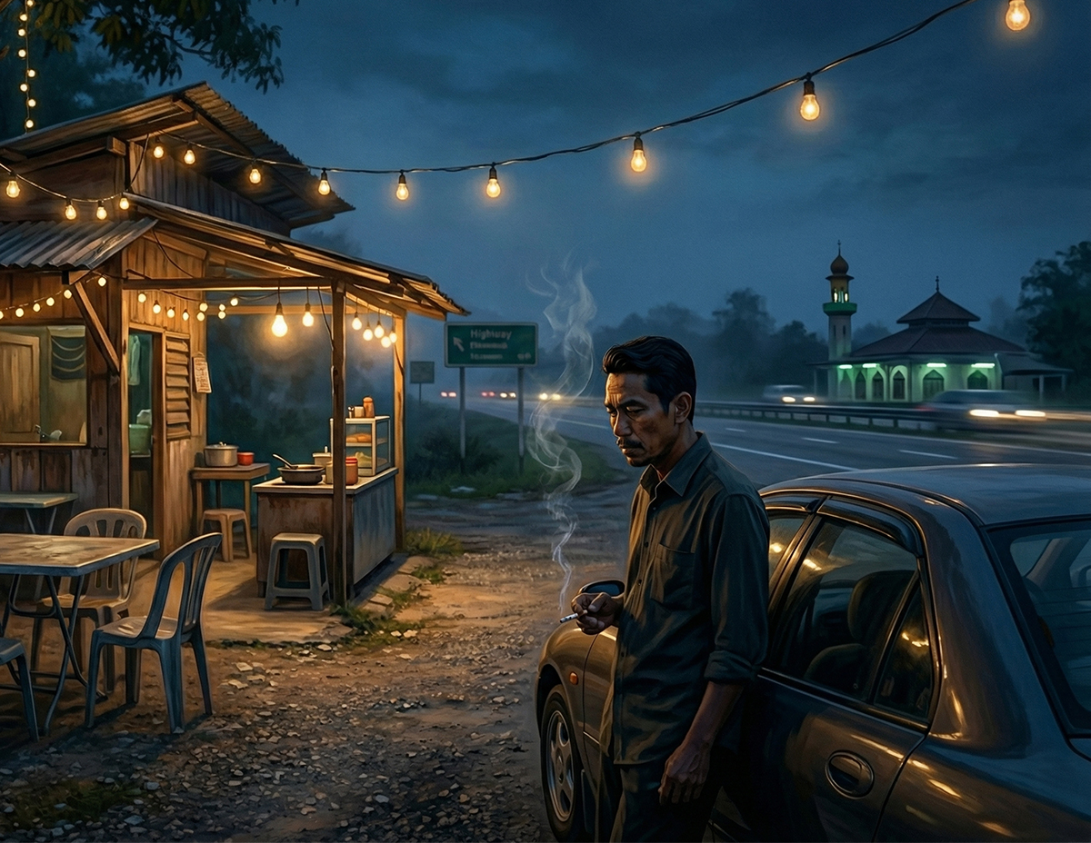 Akhirnya mereka ambil keputusan berhenti menjamu selera di sebuah warung berhampiran susur masuk ke lebuh raya. Remang senja sudah beransur gelap. Azman toleh jam di tangan, sudah hampir pukul 7.30 malam. Sayup-sayup azan Maghrib berkumandang dari surau berdekatan.