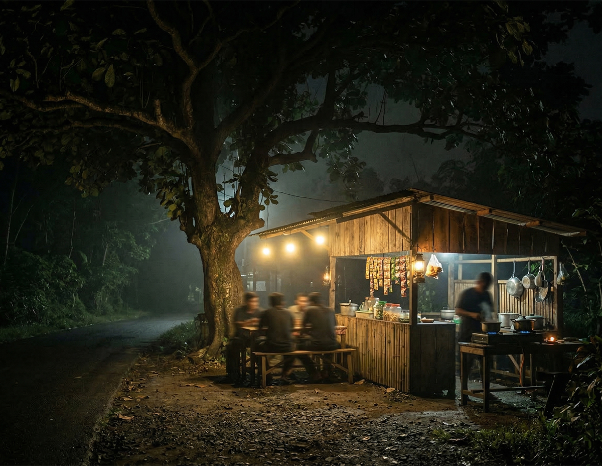 Dan setiap kali pulang dia akan berhenti menjamu selera di warung berdekatan pohon ketapang tersebut. Walaupun lewat malam, namun warung tersebut tetap beroperasi sehinggakan dia sudah mengenali tuan warung di situ.