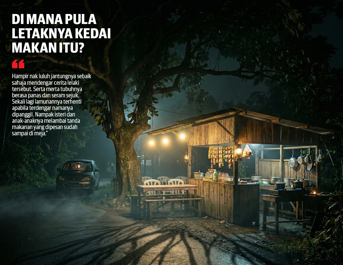 “Err.., pak cik hendak cakap terus terang pun rasa serba salah. Tapi macam inilah tuan, sebenarnya warung yang tuan maksudkan itu sudah bertahun tak ada. Warung tu dah kena rempuh dengan lori treller waktu awal pagi. Mungkin pemandunya terlelap barangkali, kalau tak silap pakcik tuan kedai dan pembantunya meninggal dunia serta merta kat situ,” balas lelaki tua tersebut sedikit gugup.