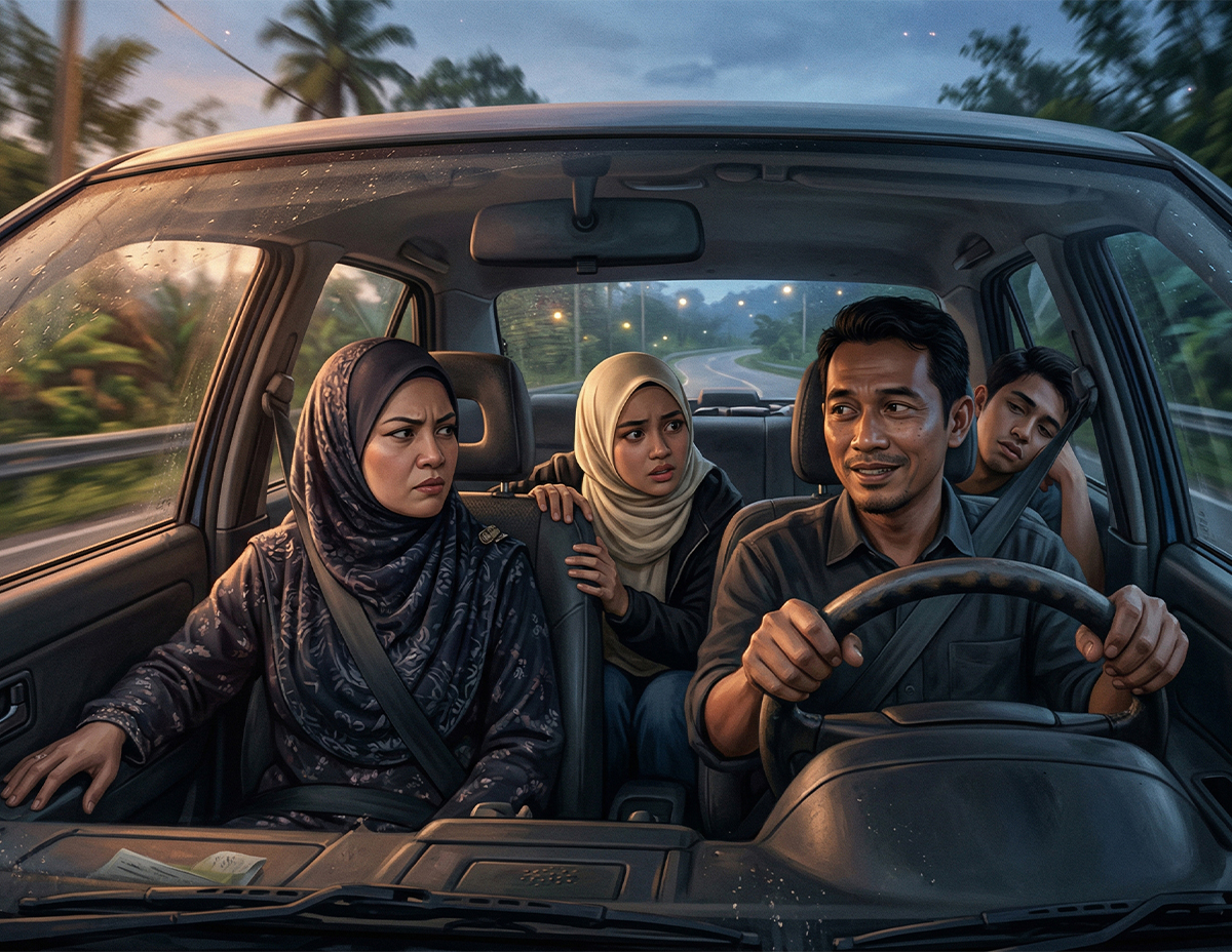 Sudah dua kali abang pusing jalan ini tapi warung yang abang cakap itu langsung tak jumpa. Kita berhentilah makan dekat mana-mana, saya dengan anak-anak pun lapar ni,” kata isterinya Zimah.