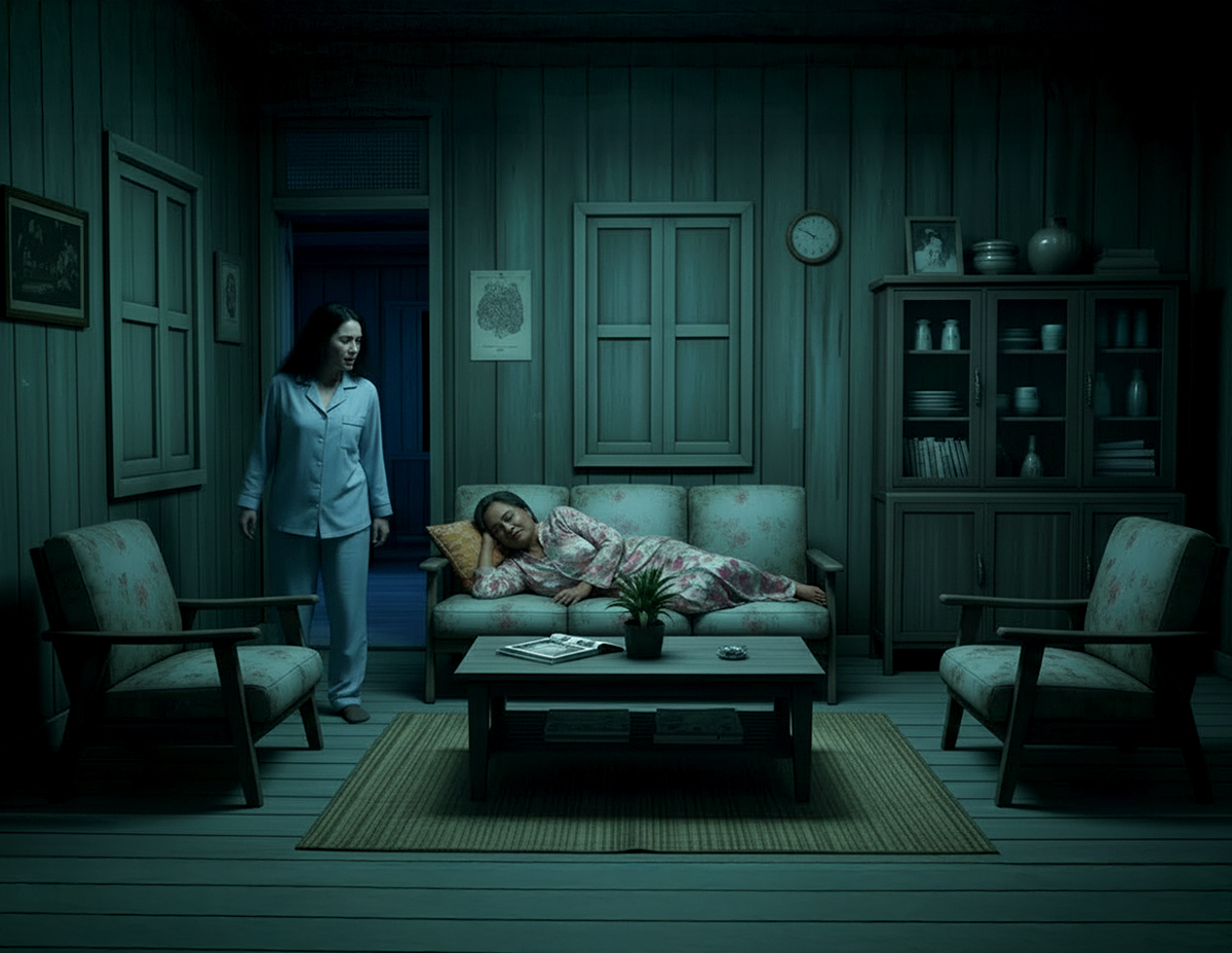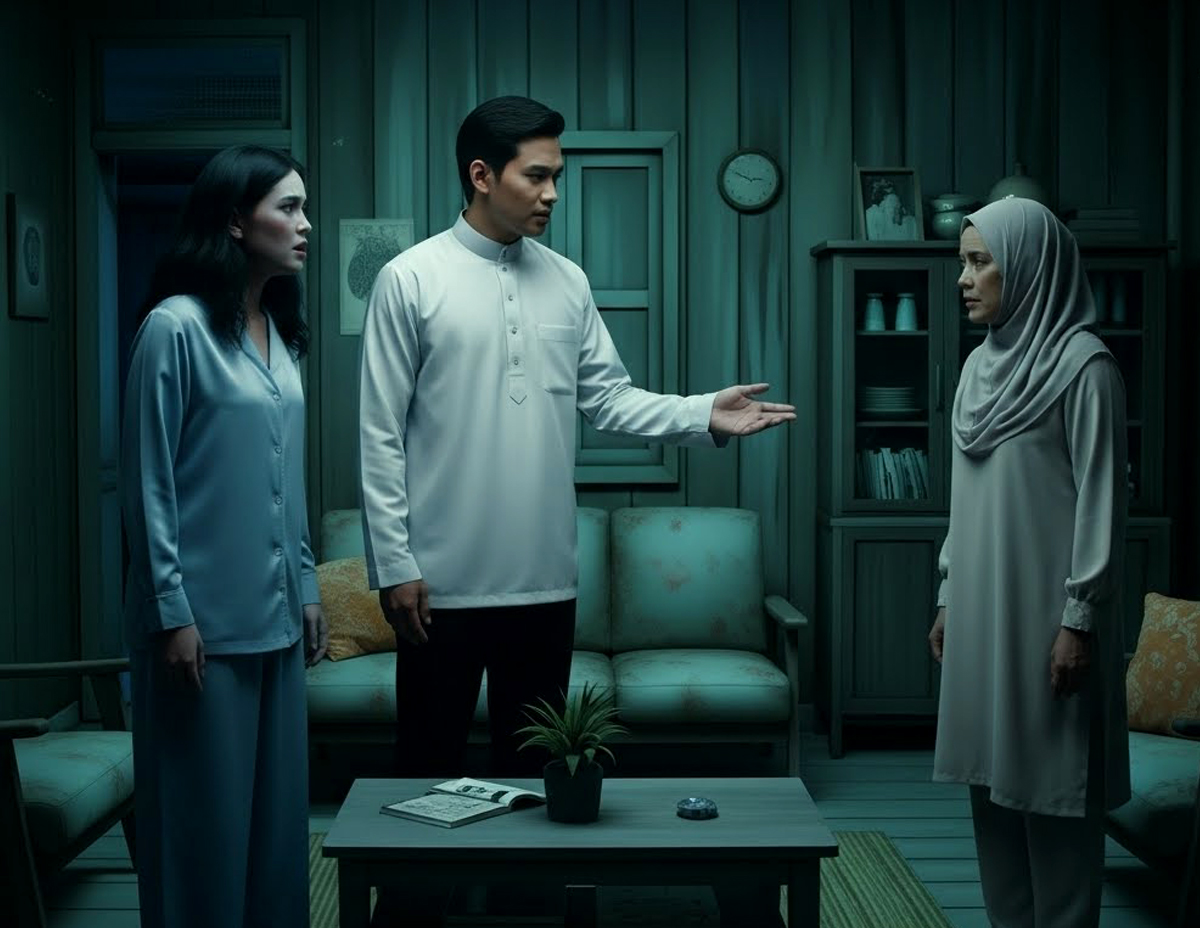 Kelibat itu terus hilang, dan Siti berlari keluar dari biliknya menuju ke ruang tamu.
