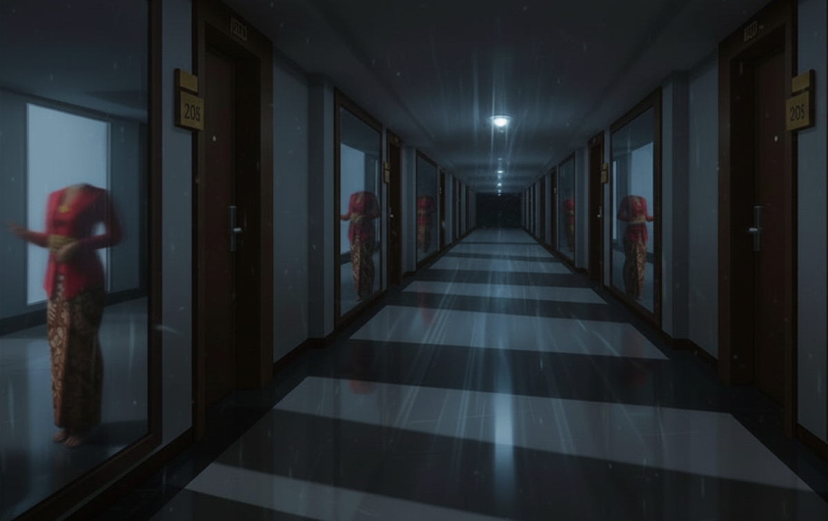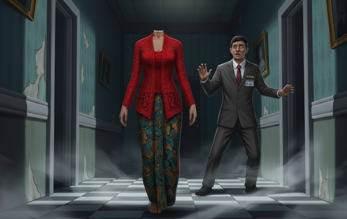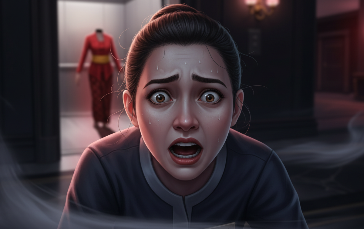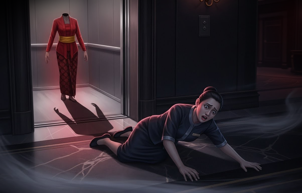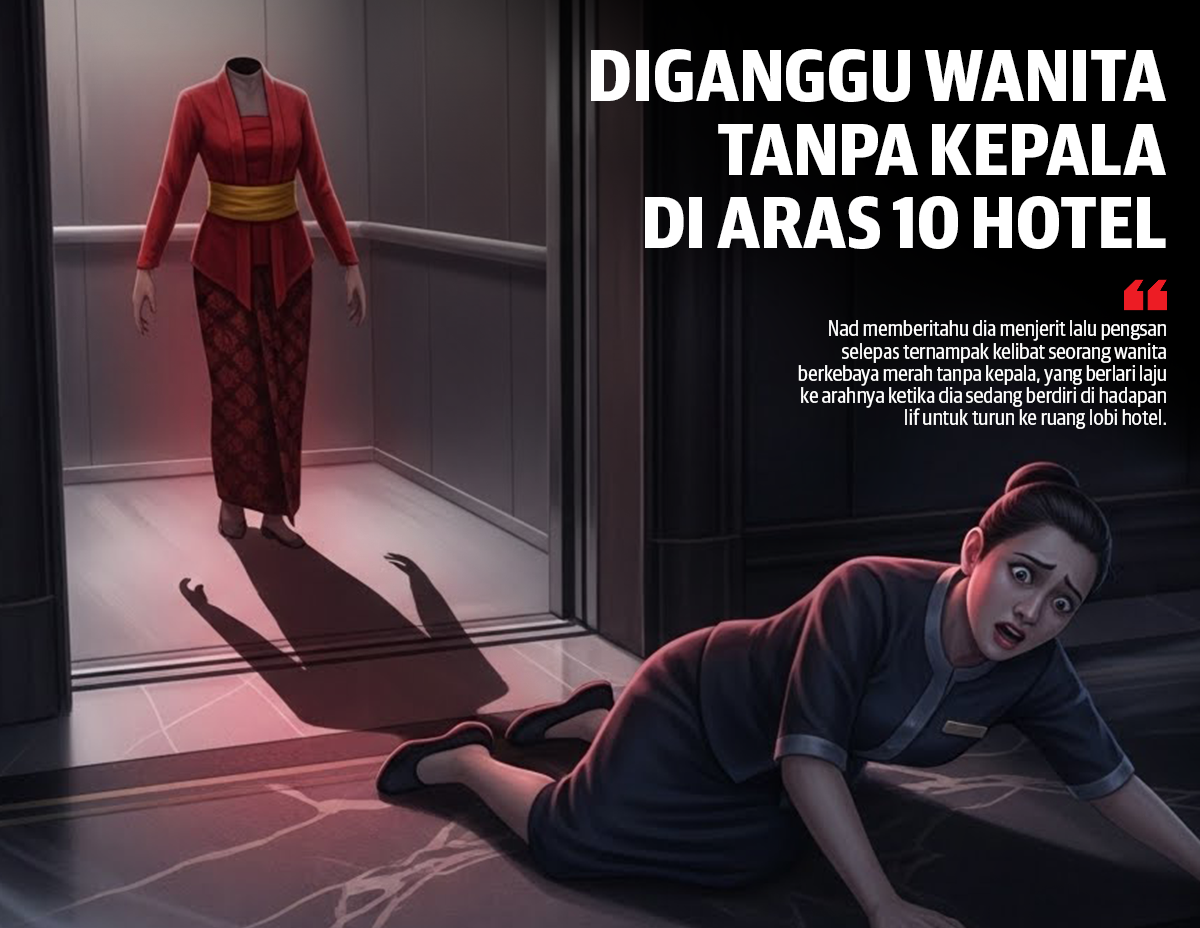 Terkejut, dia bergegas naik untuk melihat Nad, yang ketika itu sudah pengsan. Beberapa hari kemudian, Nad memberitahu dia menjerit lalu pengsan selepas ternampak kelibat seorang wanita berkebaya merah tanpa kepala, yang berlari laju ke arahnya ketika dia sedang berdiri di hadapan lif untuk turun ke ruang lobi hotel.