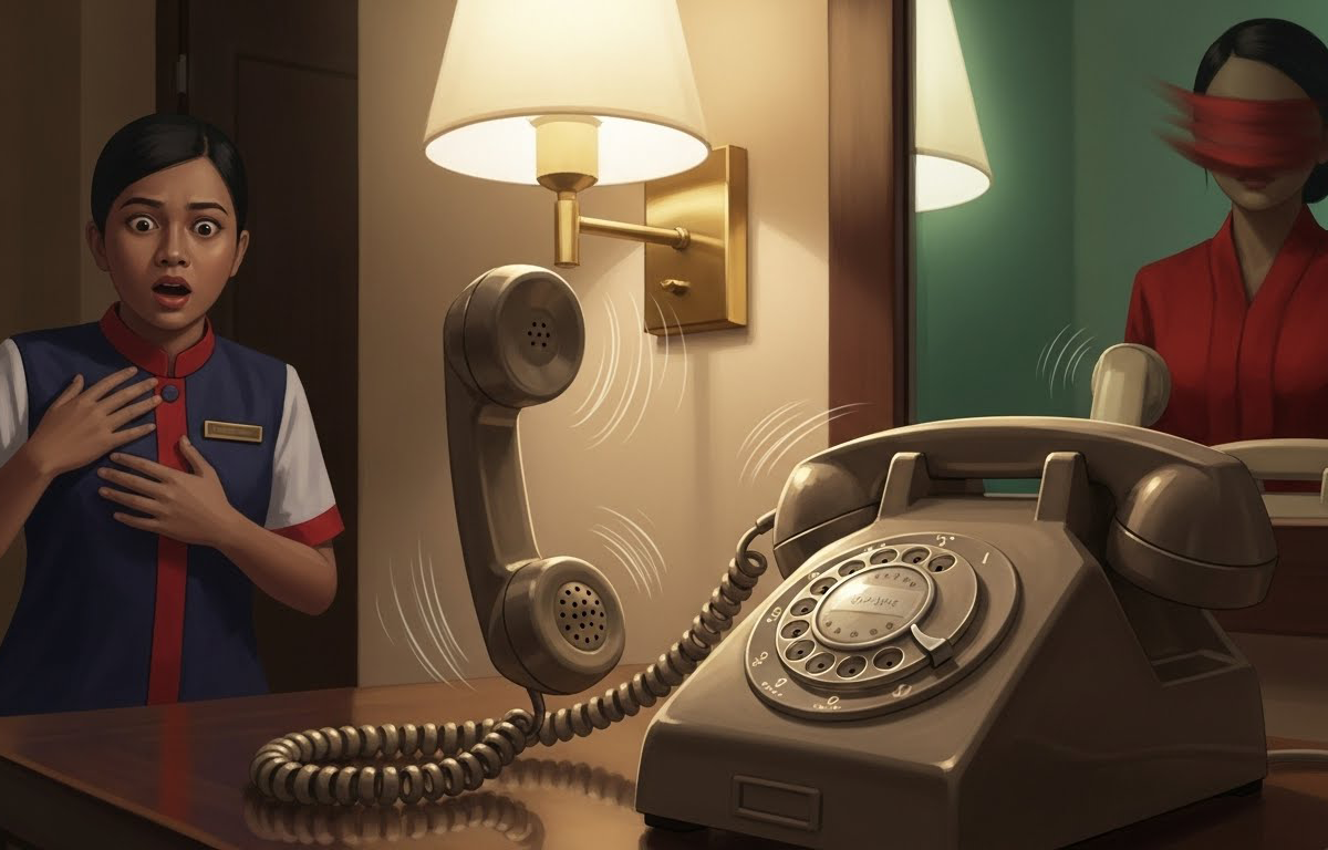 Tiba-tiba, telefon dalam bilik itu berdering tanpa henti. Sangka Lan, itu pasti kerja rakan-rakannya yang lain, untuk sengaja menakut-nakutkannya.