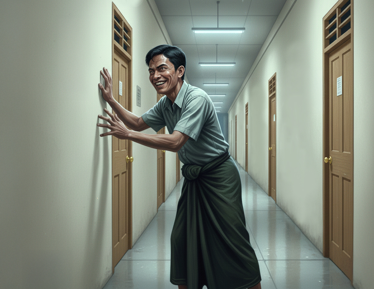 Cerita Suratman lagi, tiba-tiba muncul sepasang tangan sasa berpaut di atas tembok koridor.