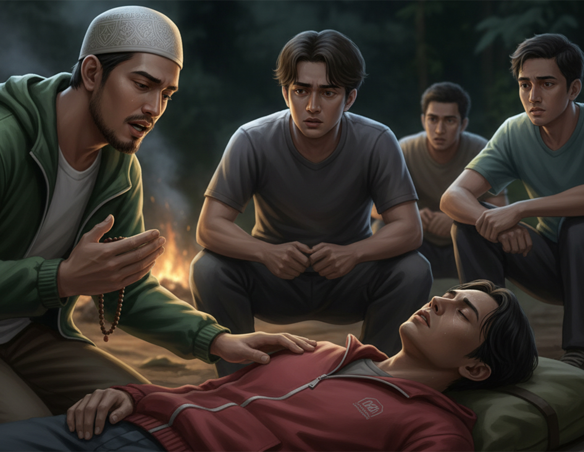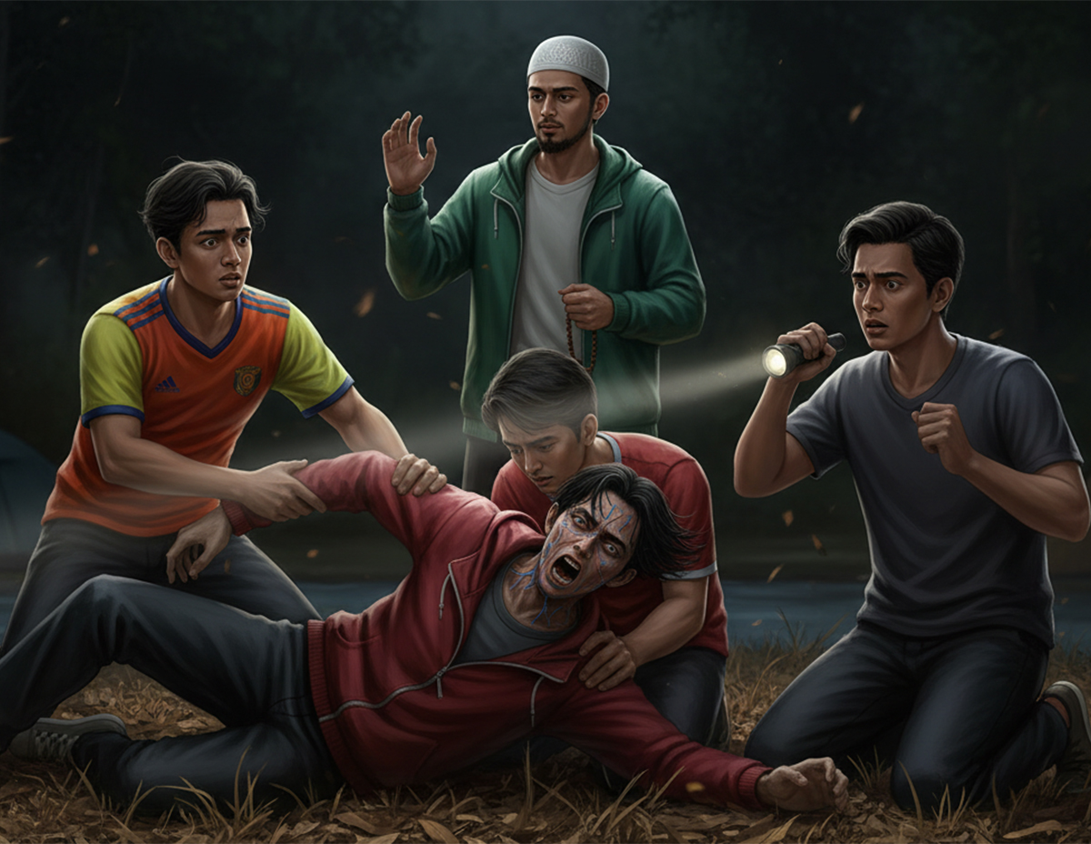 “Semua pelajar lelaki cepat-cepat bawa Azim ke khemah, tetapi tiba-tiba badan Azim mengejang dan dia mula menjerit dengan suara garau dan meronta-ronta,” katanya.