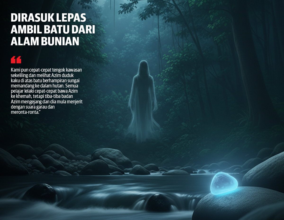 Menurut ustaz, batu itu ada ‘tuannya’ dan diambil dari alam lain, dan entah macam mana Azim boleh melihat batu itu sehingga dia diggangu makluk halus.