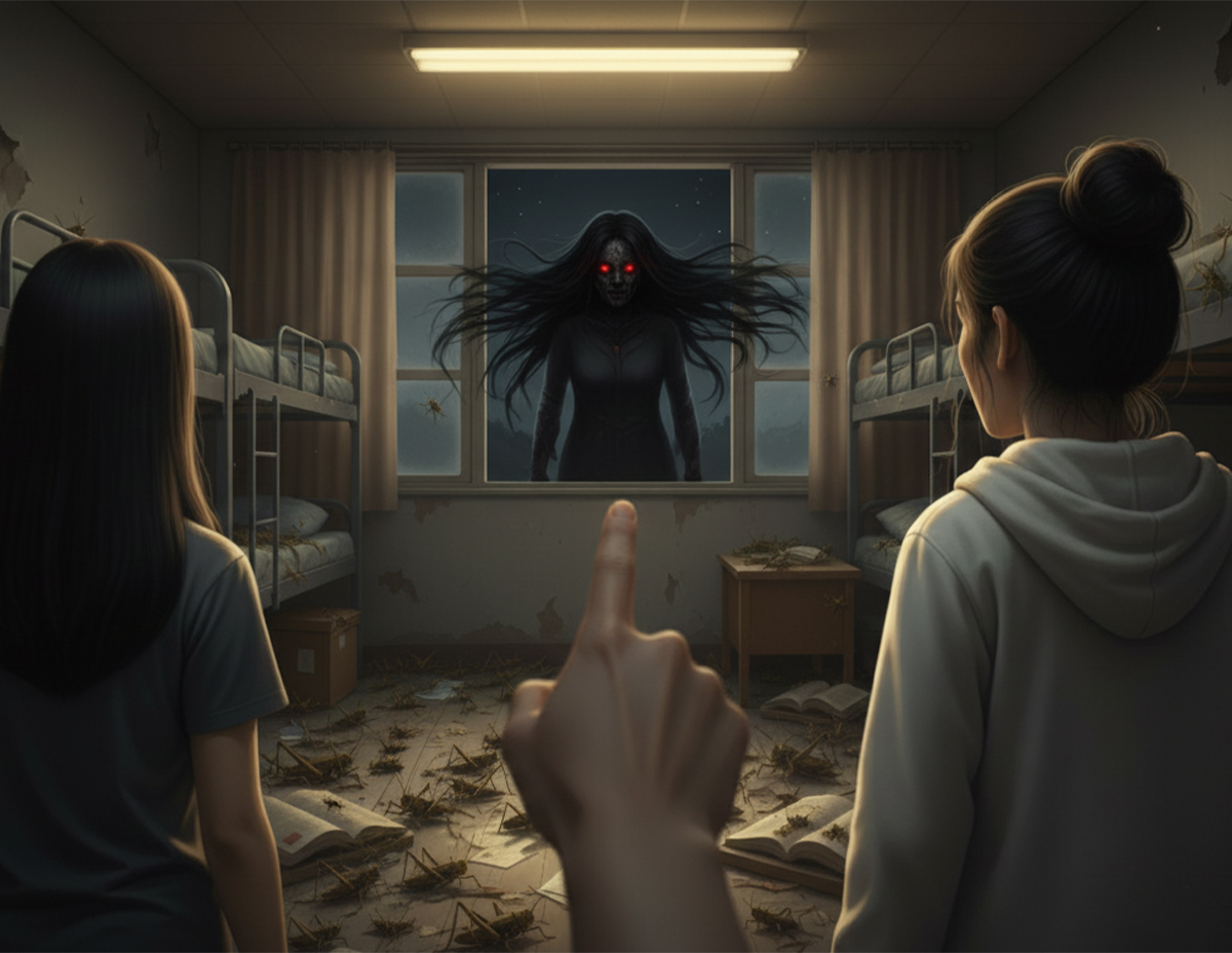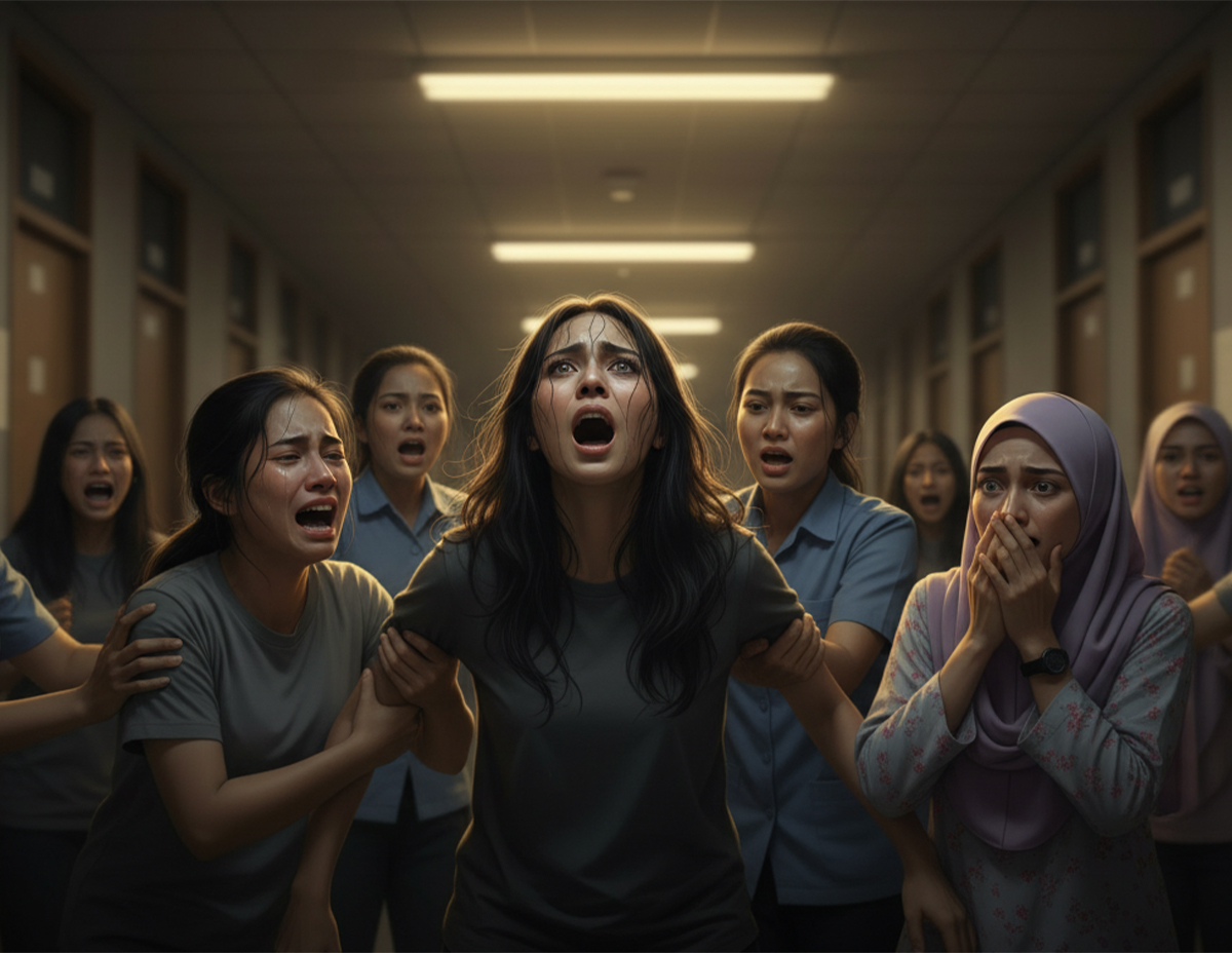 Kemudian warden datang kerana mendengar bunyi bising dan membantu untuk membuang serangga yang dikatakan belalang pelesit. Dalam keadaan kecoh itu, ada seorang pelajar yang tiba-tiba berteriak sambil tangannya menunjuk ke arah tingkap.