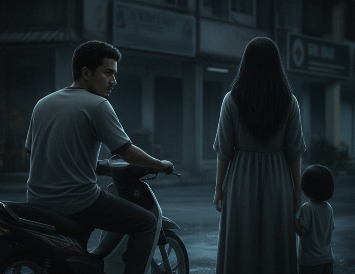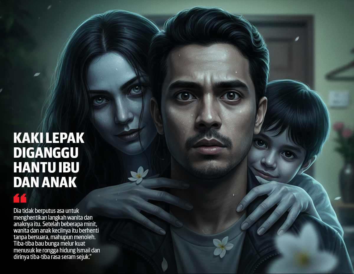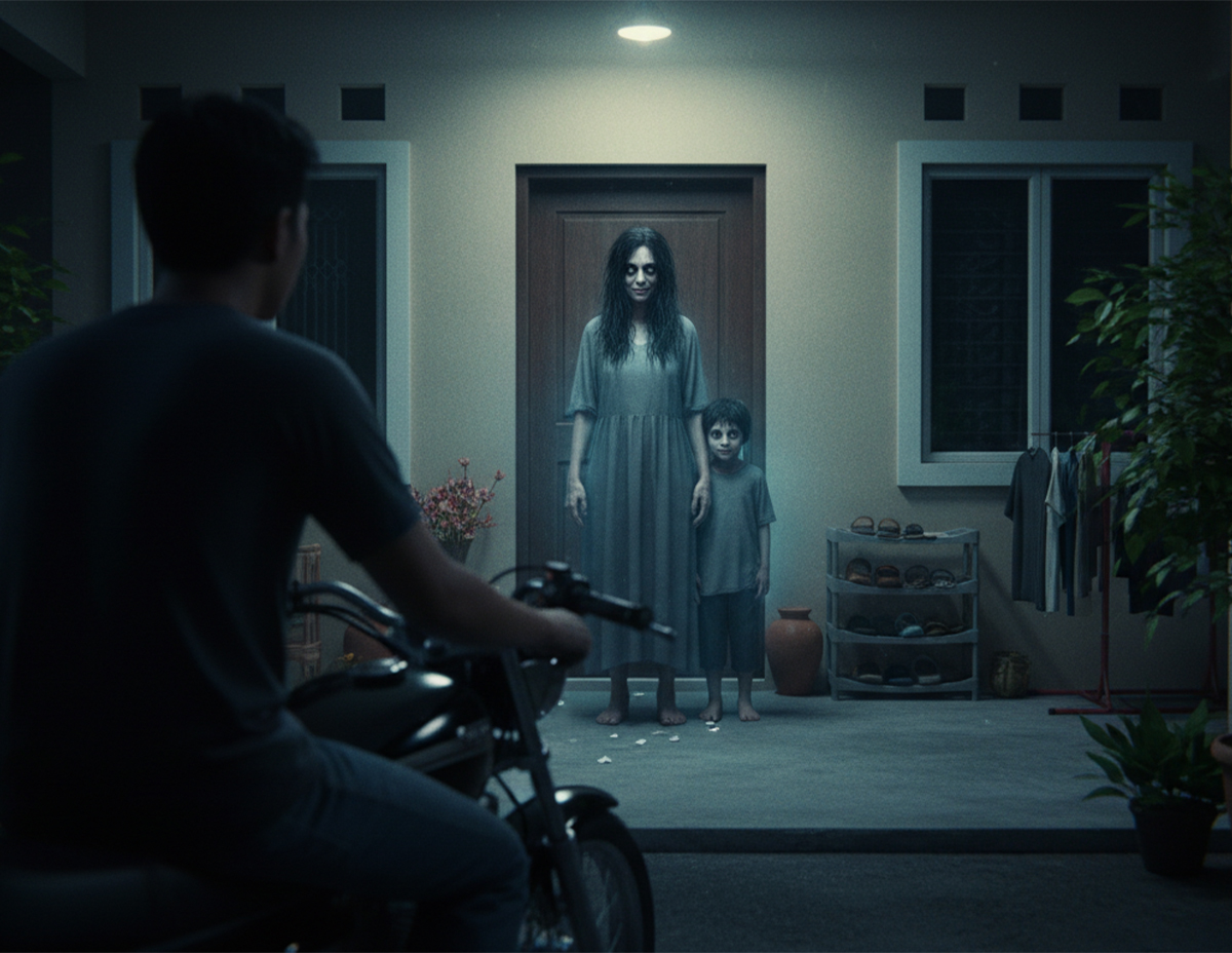 Lebih seram, sewaktu dia hampir tiba rumah, dia ternampak kelibat wanita dan anak kecil itu berada di depan pintu rumahnya.