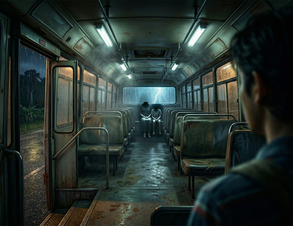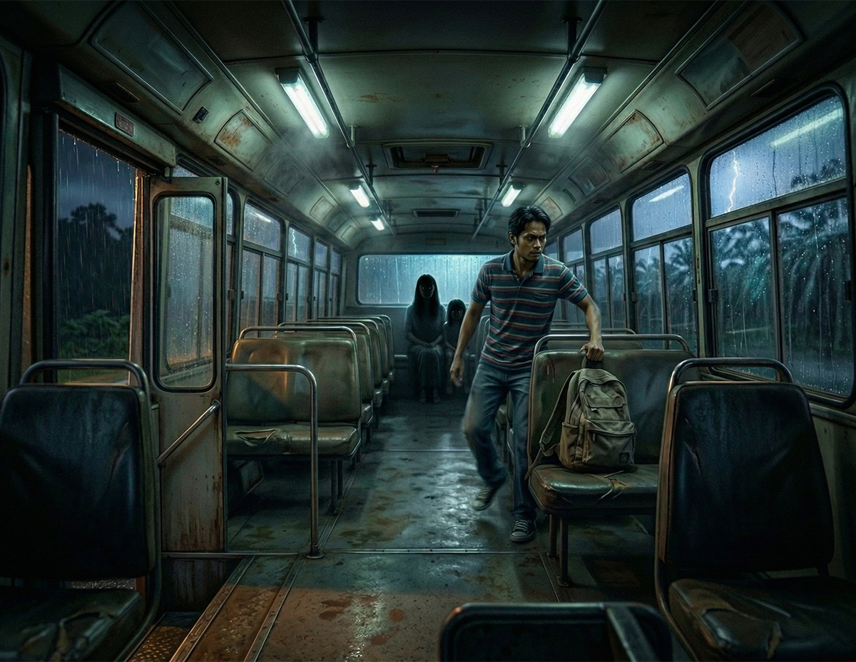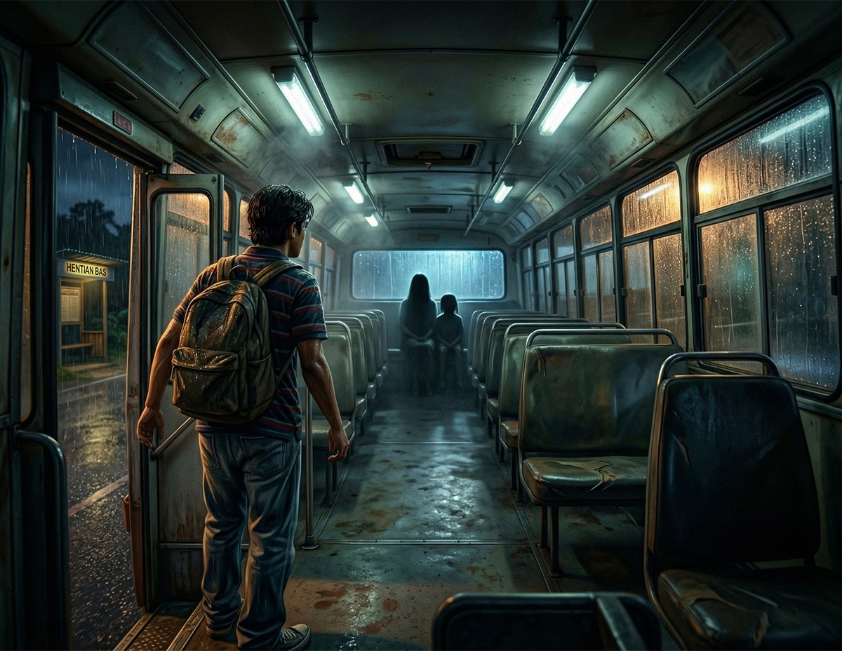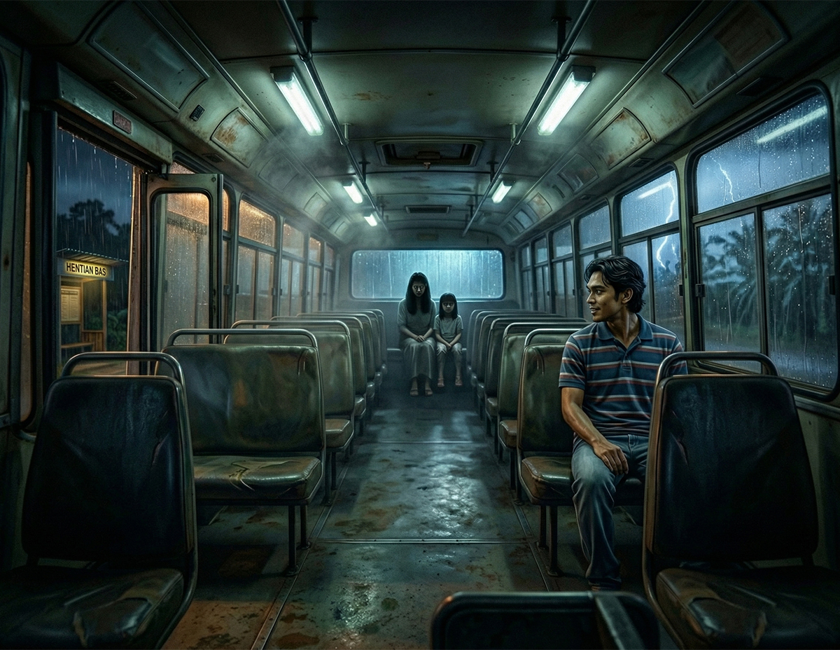 Belum pun sempat dia duduk di kerusi, bas yang ditunggu akhirnya sampai. Setelah naik dan membayar tambang terus dia ambil tempat duduk di barisan tengah. Dia toleh sekeling, nampak kosong tanpa ada penumpang lain. Namun apabila dia menoleh buat kali kedua di bahagian belakang dia terus terlihat seorang wanita bersama anaknya yang berusia dalam lingkungan 8 hingga 10 tahun sedang duduk memandang ke arah luar tingkap.