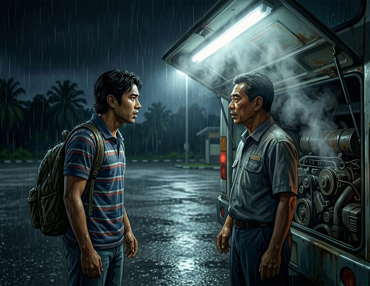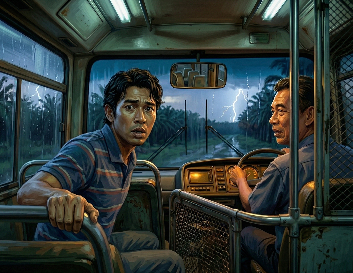 Terus Amar menceritakan apa yang dilaluinya sejak dia menaiki bas tersebut sehinggalah dia turun di terminal itu. Ternganga mulut pemandu itu apabila mendengar cerita Amar. Nampak raut wajahnya yang sedikit cemas dan tidak keruan.