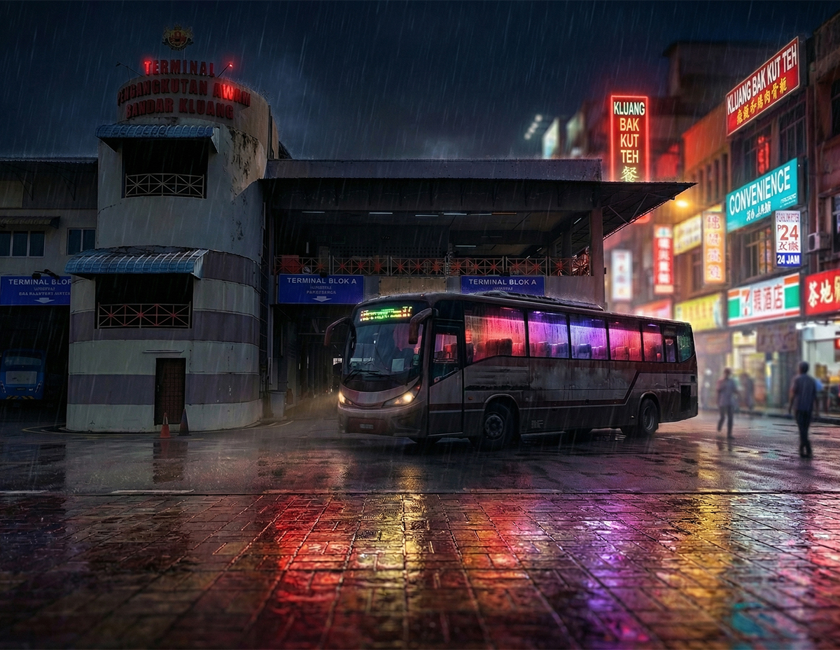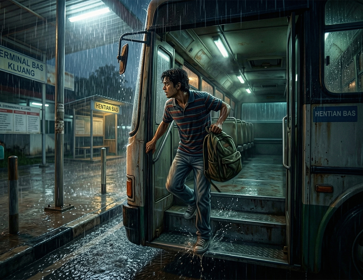 Nasib baiklah bas yang dinaikinya sudah masuk ke kawasan pekan di bandar Kluang. Di luar kelihatan lampu-lampu neon menyinari persekitaran. Dalam hati dia tidak putus-putus berdoa mengucapkan syukur kerana sampai ke destinasi.