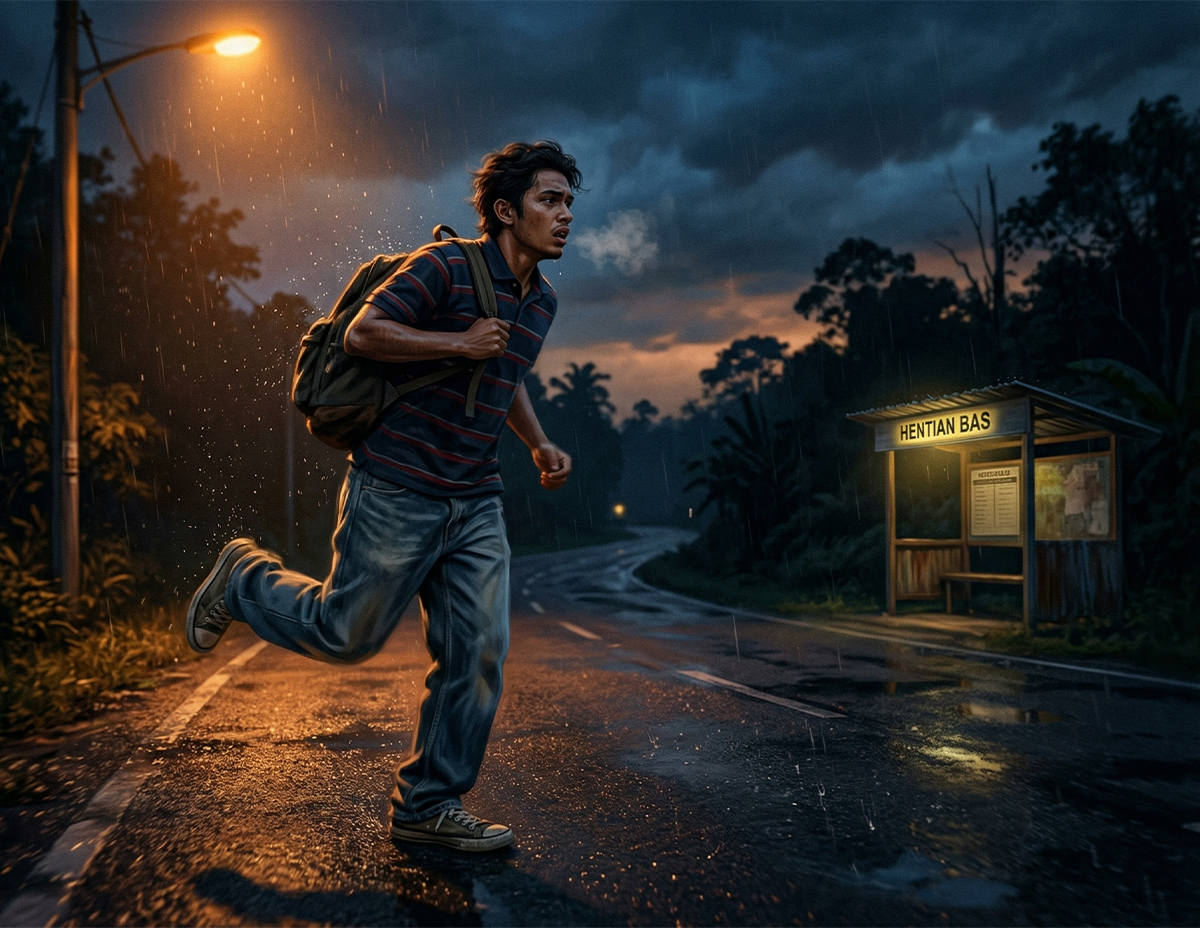 Amar melihat jam di tangannya sudah hampir pukul 12.30 malam. Dia lantas berlari anak menuju ke arah perhentian bas berhampiran jalan besar. Sesekali dia berasa titisan rintik hujan mengenai tubuhnya. Mungkin hujan akan turun sebentar lagi, bisiknya dalam hati.