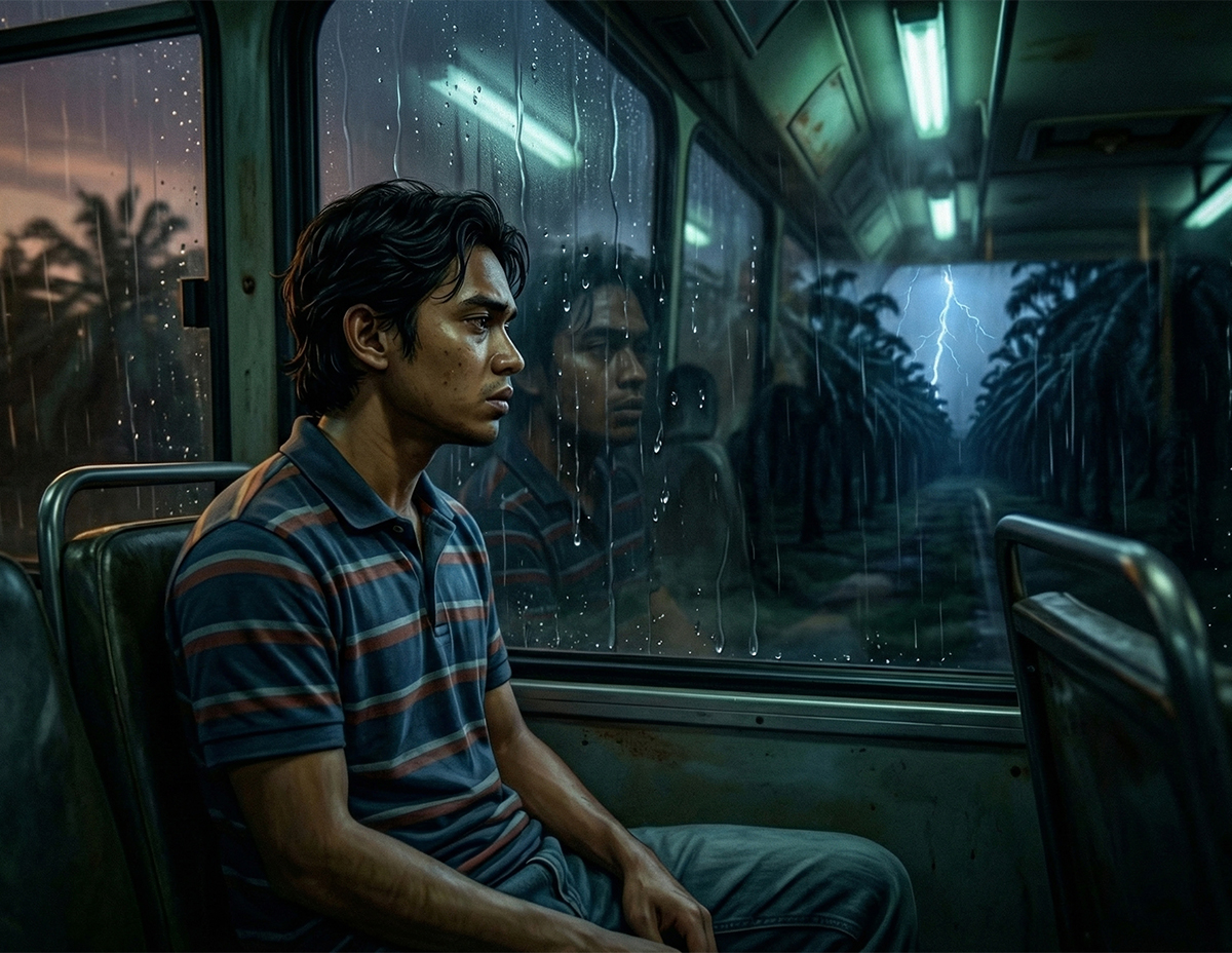 Dia menarik nafas lega. Ada juga orang lain rupanya, ingatkan hanya dia seorang diri dalam bas tersebut, katanya dalam hati. Hujan di luar sudah lebat mencurah-curah. Bas yang tadinya bergerak laju kini dipandu perlahan, mungkin dalam keadaan hujan lebat begini jalan raya licin dan pandangan juga agak terhad.