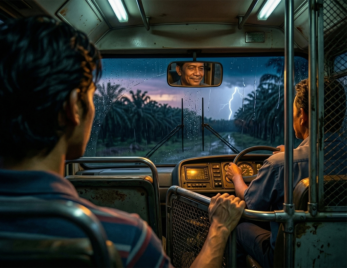 Amar memandang ke luar tingkap namun tiada apa yang mampu dilihatnya kerana cuaca amat gelap tambah pula di kiri kanan jalan hanya dipenuhi deretan pohon-pohon kelapa sawit dari ladang berhampiran.