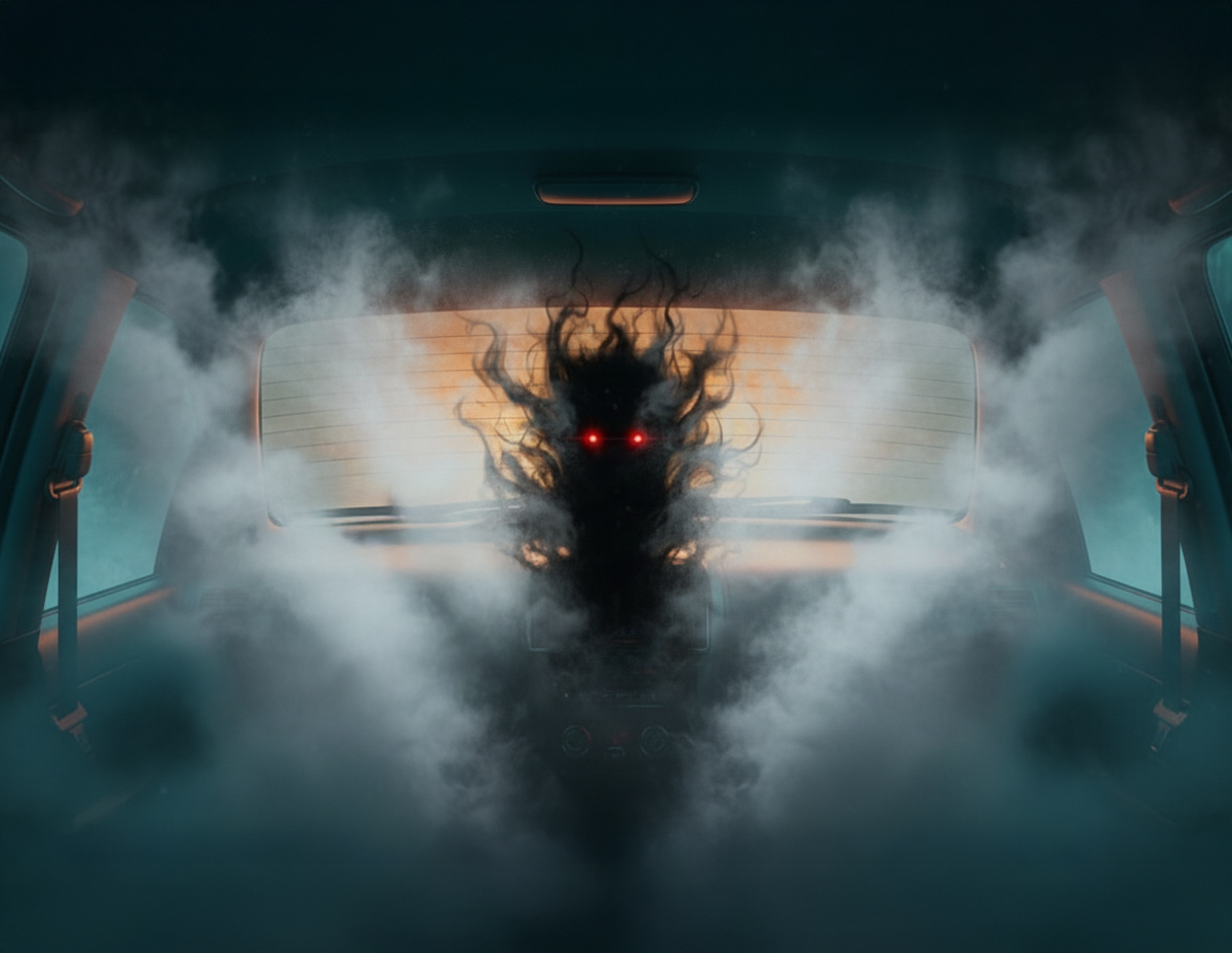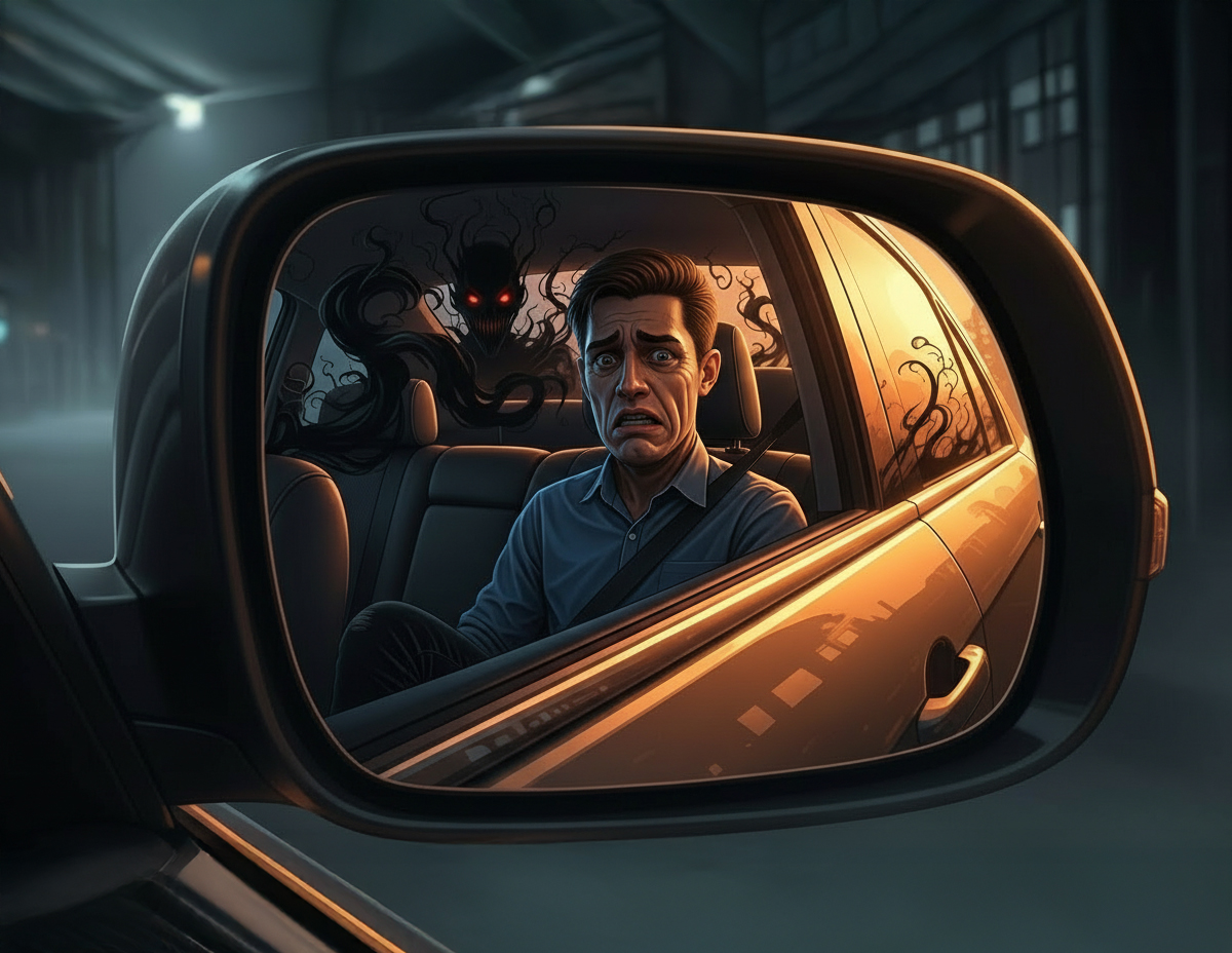 Ini kerana dia terasa seperti ada sosok berwarna hitam duduk di kerusi belakang keretanya dan merenungnya menerusi cermin belakang kereta.