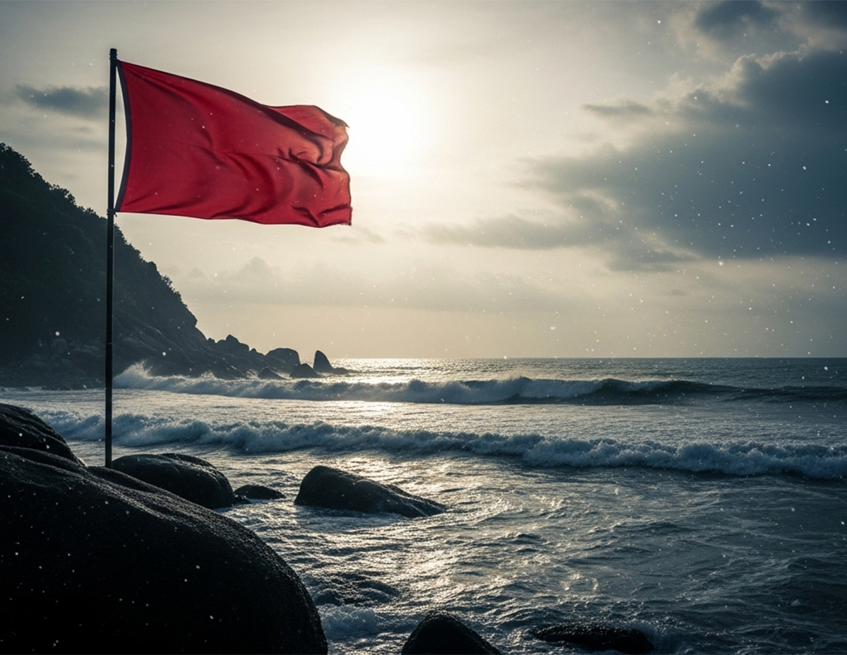 Di sini memang kita pasang bendera merah sebagai amaran kepada pengunjung agar tidak mandi manda di kawasan tertentu terutama di kawasan berbatu.