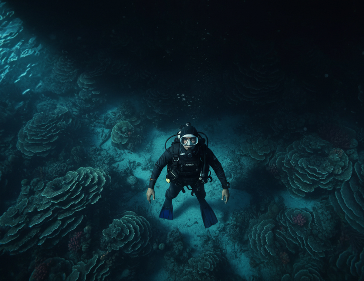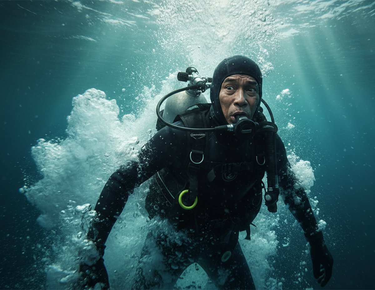 “Hari masih siang dan cuaca juga dalam keadaan baik ketika saya memulakan selaman namun secara tiba-tiba saya dapati keadaan laut menjadi gelap.