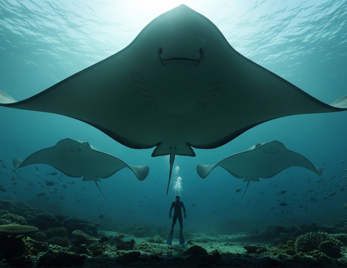 Awalnya saya agak panik juga mana tidaknya bila saya mendongak ke atas saya dapati diatas kepala ada seekor ikan pari gergasi yang begitu besar dan terlalu besar. Besarnya sama dengan keluasan bumbung dan itu pertama kali saya lihat.