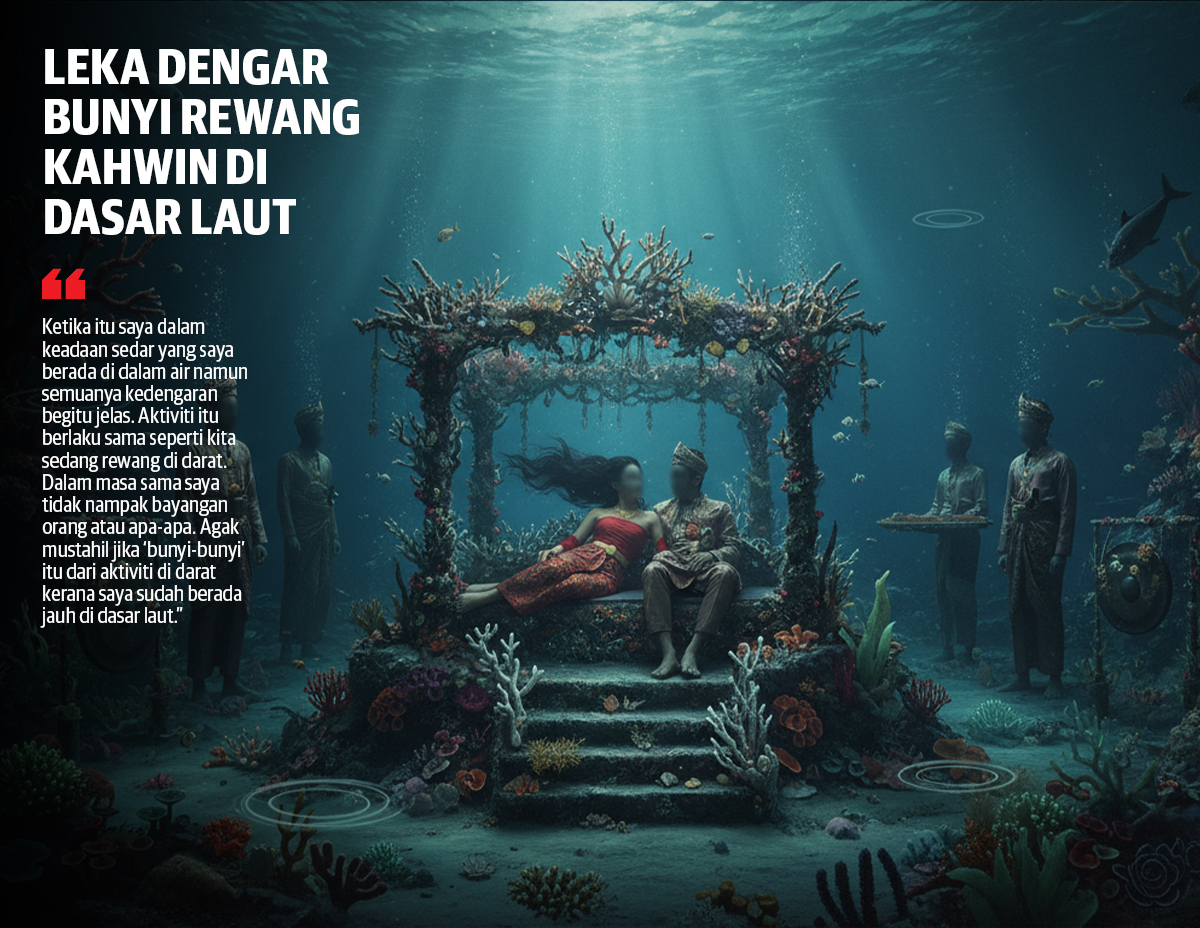 “Di sini saya memang sudah biasa melakukan latihan menyelam sendiri. Satu hari itu ketika sedang menyelam jauh ke dasar laut, secara tiba-tiba halwa telinga saya terdengar bunyi paluan kompang, suara orang riuh rendah orang seperti aktiviti rewang untuk majlis perkahwinan di sebuah kampung sedang berlangsung.