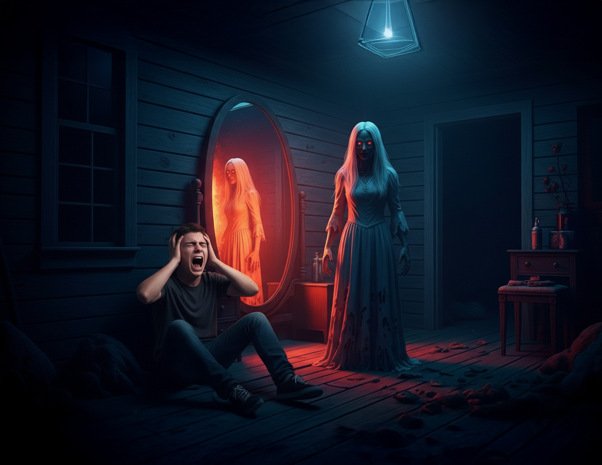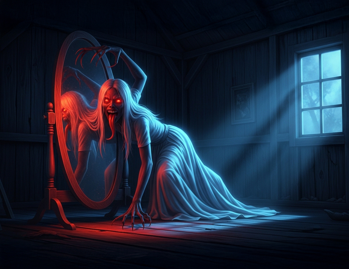 Dalam bilik itu ruang sangat tenang, hanya terdapat sebuah katil bujang dan meja solek lama dengan cermin besar, namun ketika ketika menoleh ke cermin, saya ternampak sesuatu yang tidak masuk akal.