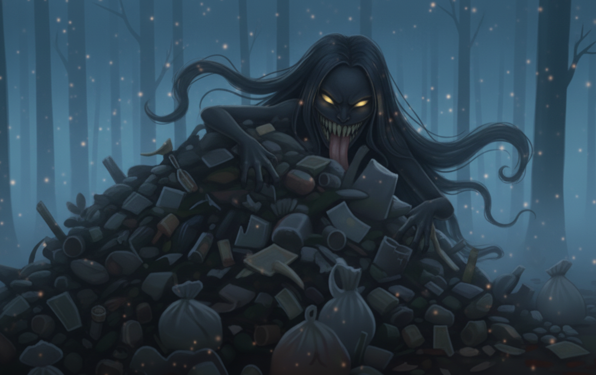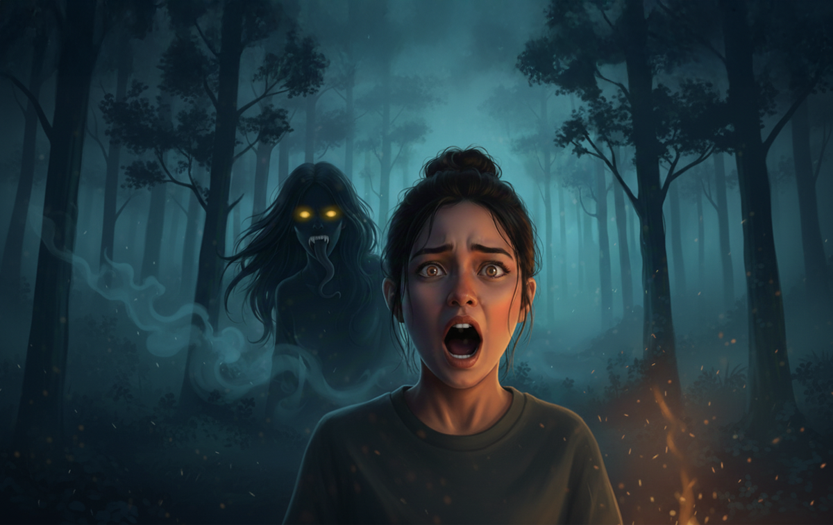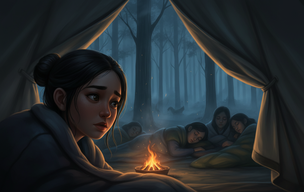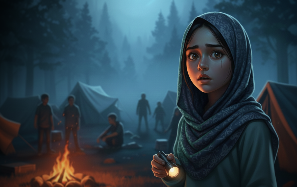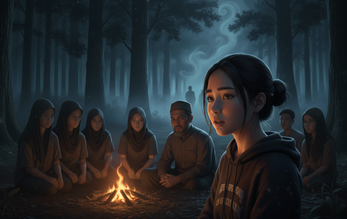 Ketika cuba untuk keluar dari khemah untuk mengambil baju sejuk, dia terlihat seakan-akan bayangan seorang wanita berambut panjang sedang mencangkung di kawasan plastik sampah yang menempatkan sisa makanan.