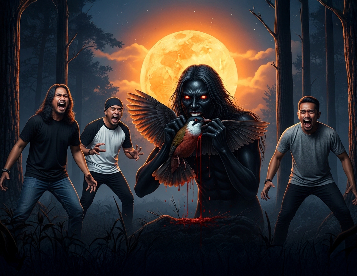 Mereka bertiga membatukan diri menahan nafas. Jantung masing-masing berdegup laju seakan tidak percaya dengan apa yang disaksikan ketika itu. Seekor demi seekor burung tersebut dimasukkan ke mulutnya. Jelas kelihatan titisan darah pekat meleleh keluar daripada mulutnya.