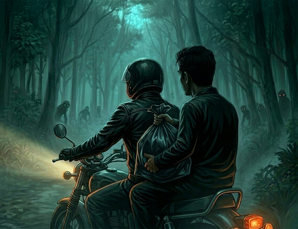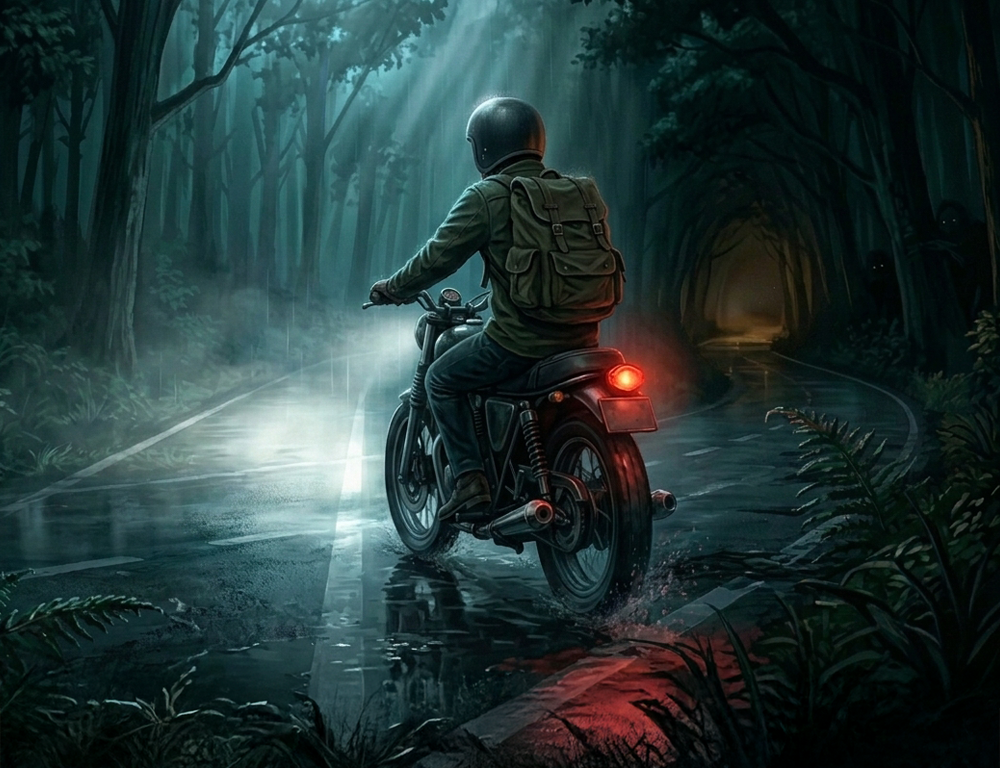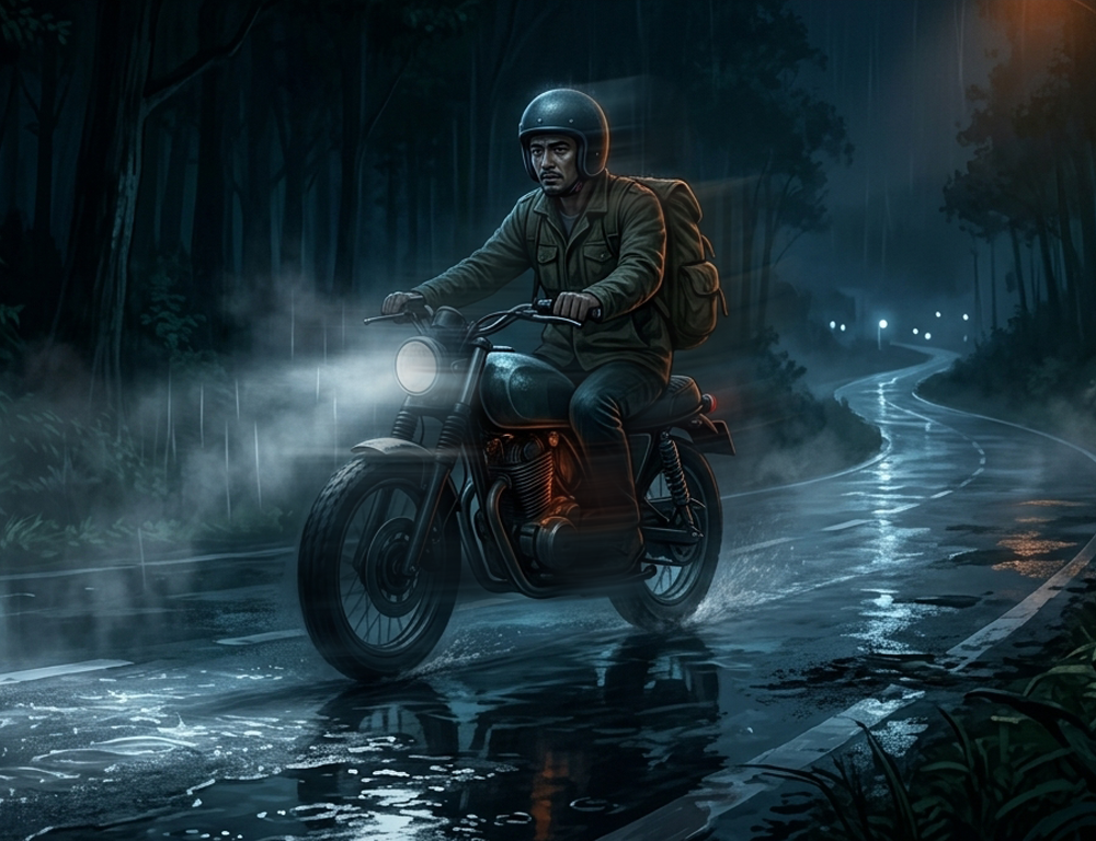 Aku menunggang motosikal dengan penuh hati-hati. Sesekali aku toleh ke kiri kanan jalan untuk lihat sekeliling. Sejuk sungguh rasanya malam itu tambah pula pakaianku masih lembap kerana dibasahi hujan sepanjang perjalanan tadi.