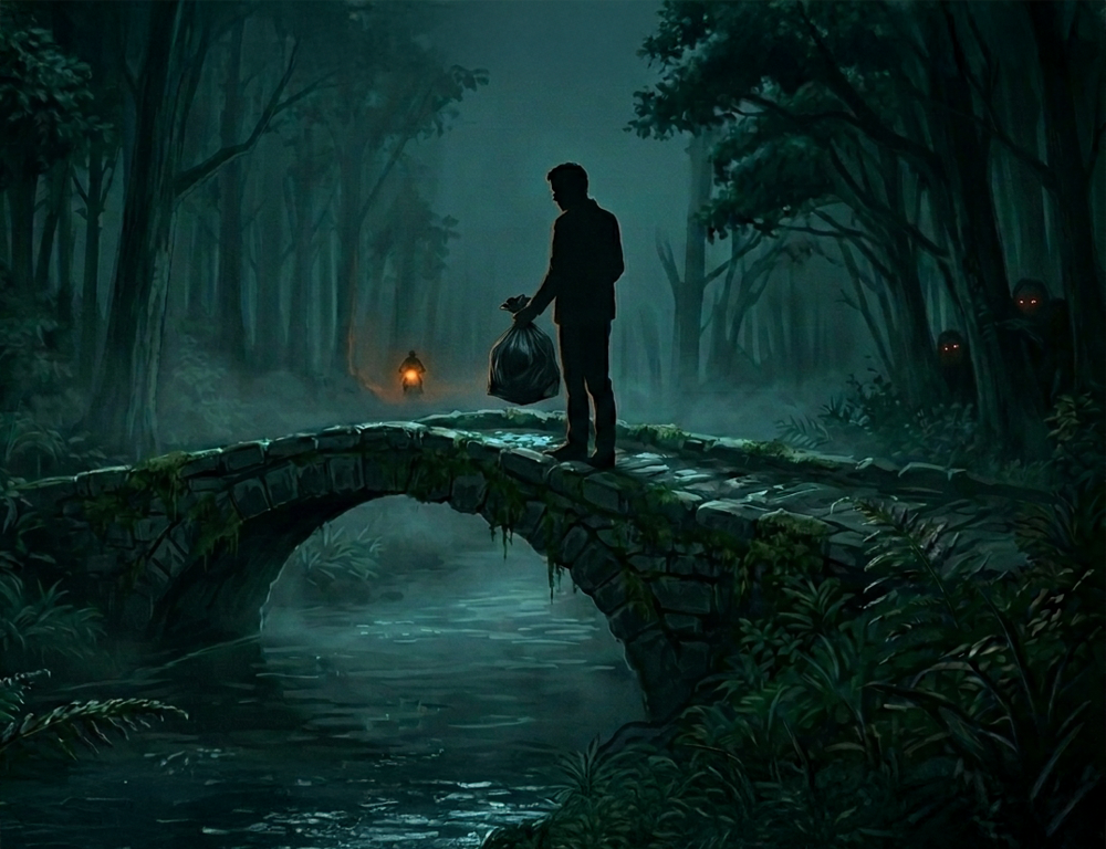Sedang tekun mengawal motosikal, tiba-tiba aku terlihat kelibat seorang lelaki sedang berdiri berhampiran jambatan di sungai berdekatan. Aku toleh ke arahnya, nampak jelas dia sedang berdiri seakan menunggu sesuatu sambil menjinjit sebuah bungkusan.