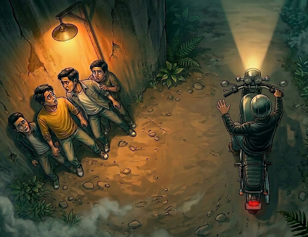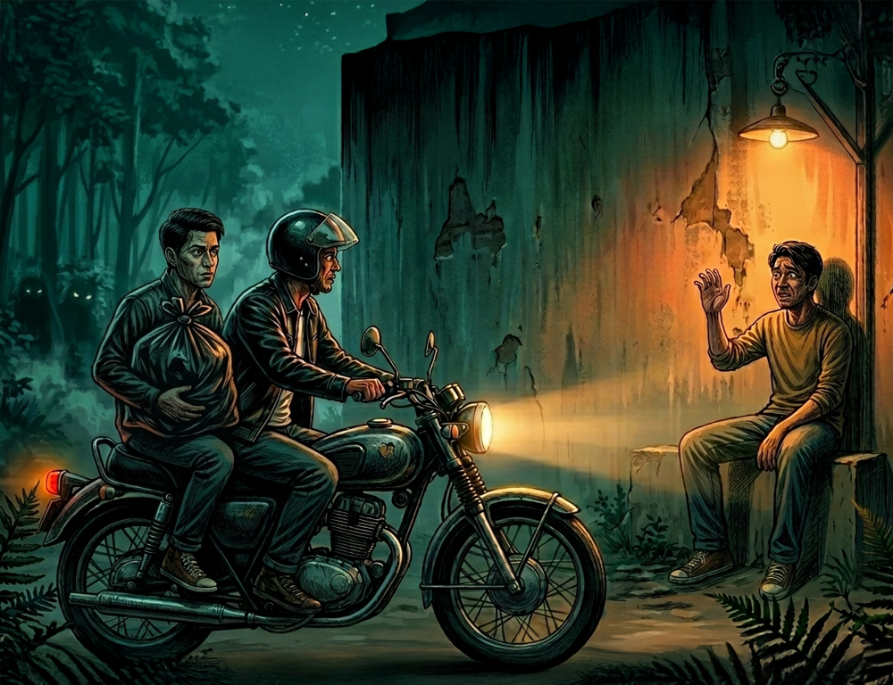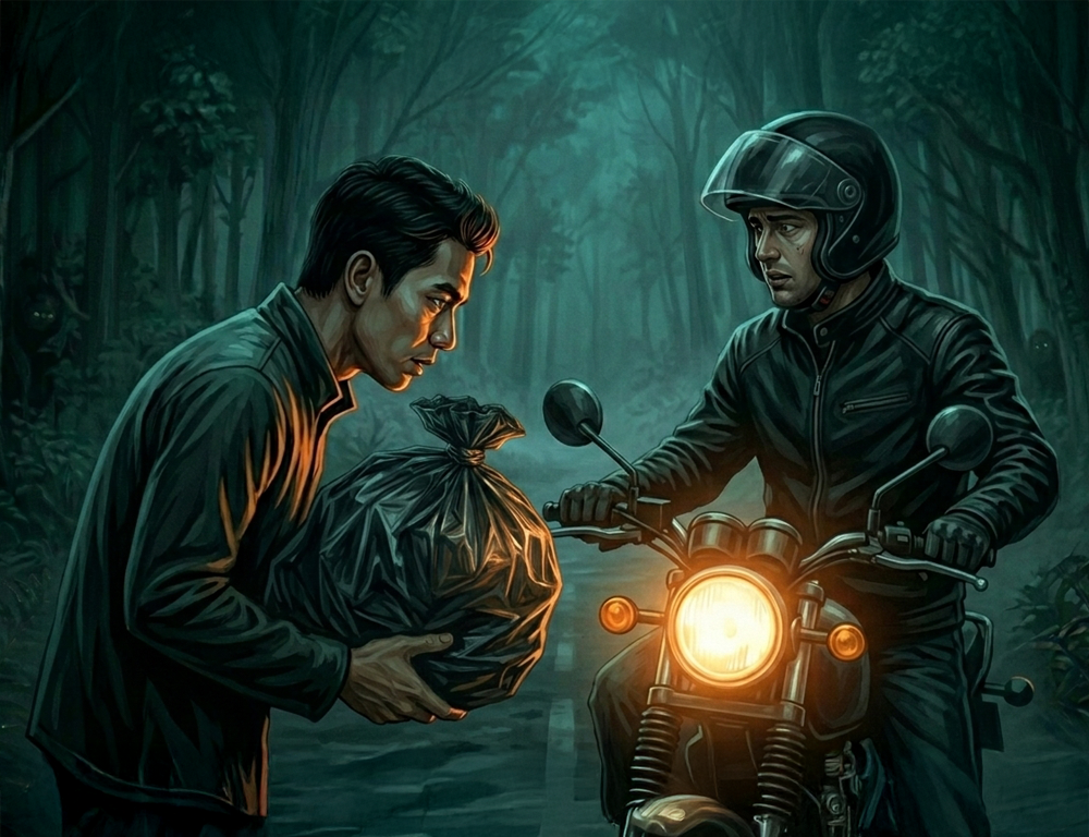 Walaupun perasaan masih berperang di sanubari, aku akhirnya ambil keputusan untuk berhenti. Dari suluhan cahaya lampu motosikal aku nampak jelas sosok yang yang sedang berdiri itu, seorang lelaki lingkungan usia lewat 30-an.