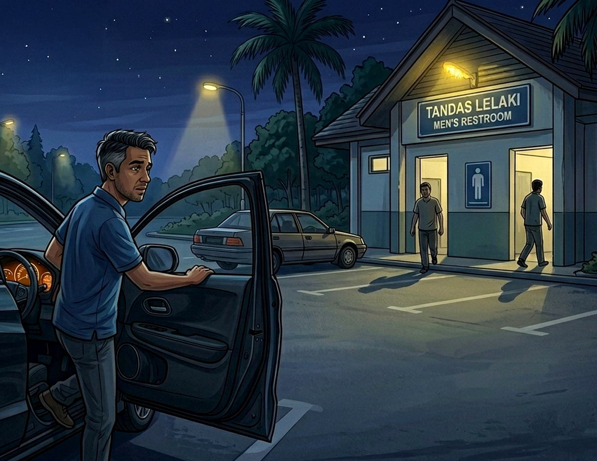 “Waktu itu tidak ramai orang yang berhenti dan hanya ada beberapa biji kereta saja diletakkan berhampiran kawasan tandas. Awalnya saya ada kelihatan beberapa orang keluar masuk tandas sehingga tiba-tiba rasa hening.