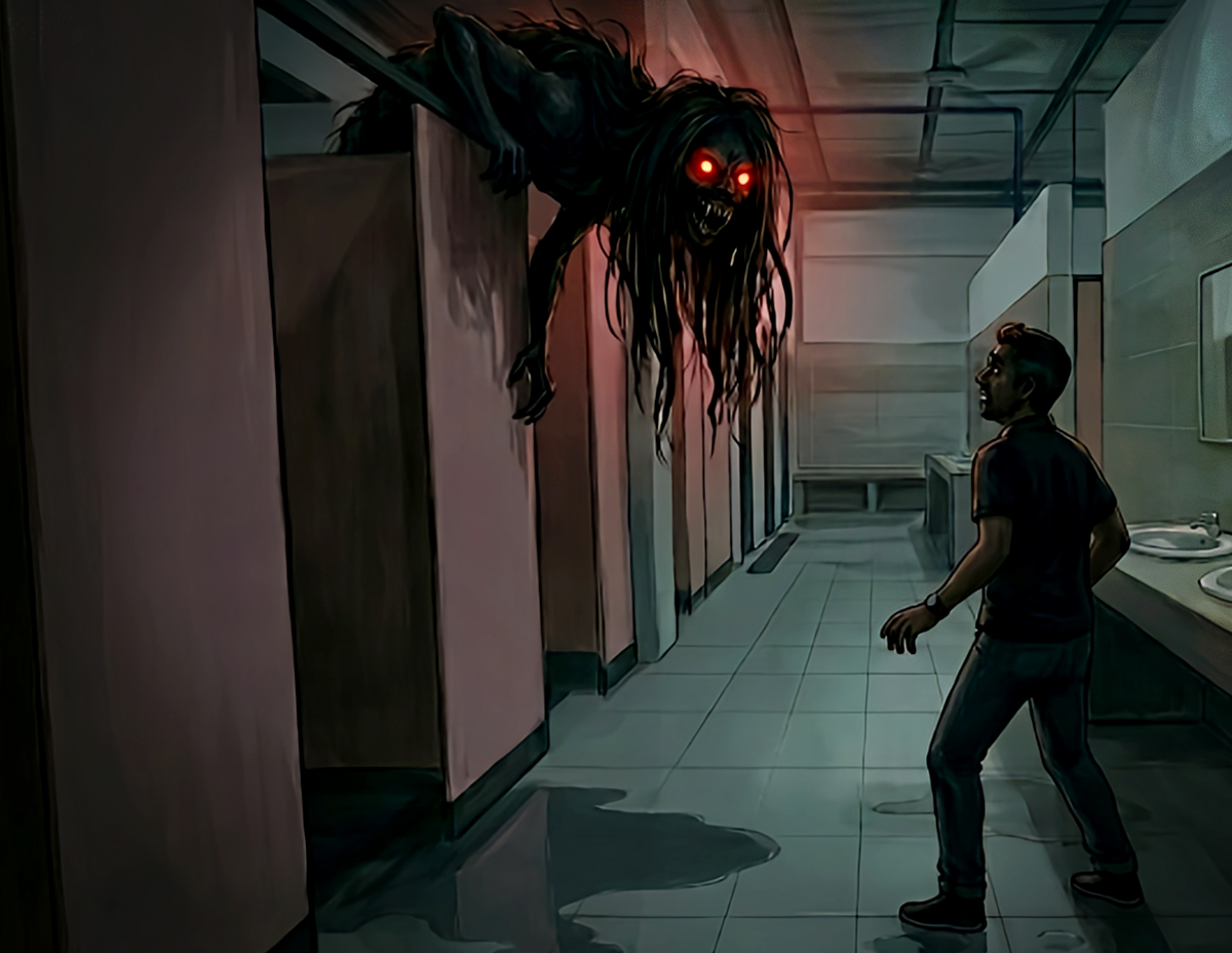 “Saya toleh ke belakang kerana mendengar seperti ada yang memanggil. Tetapi alangkah terkejut apabila melihat ada lembaga hitam dengan rambut yang panjang bertenggek di atas pintu tandas yang saya gunakan tadi.