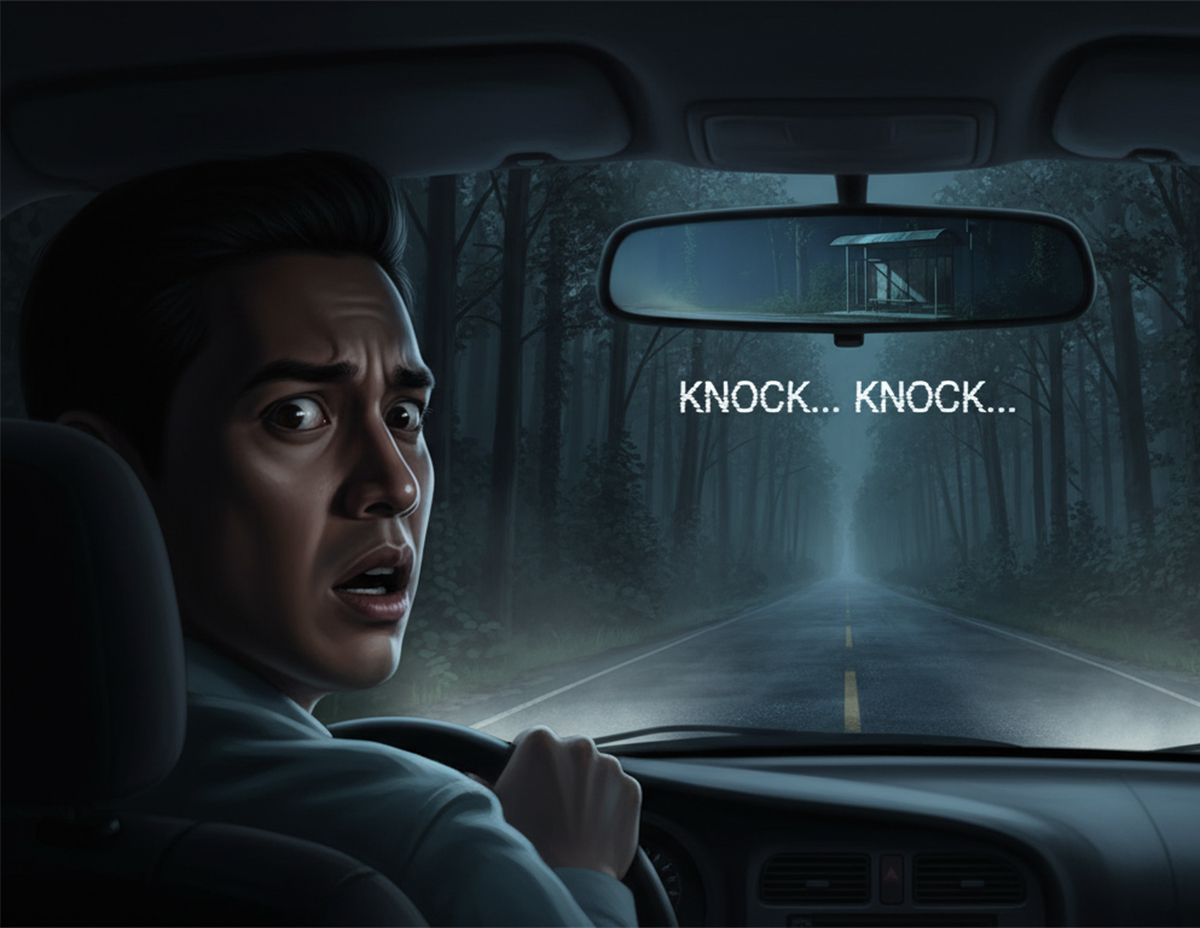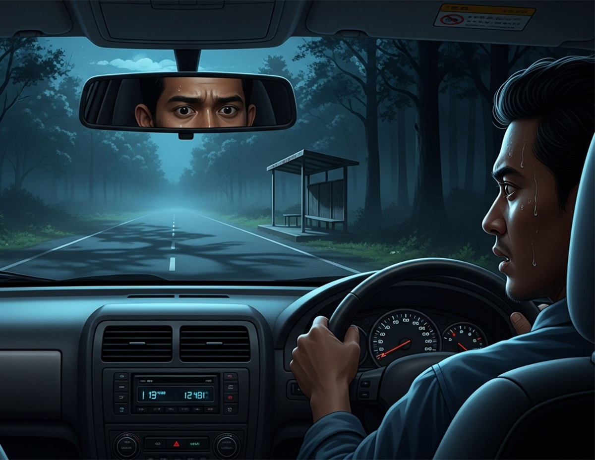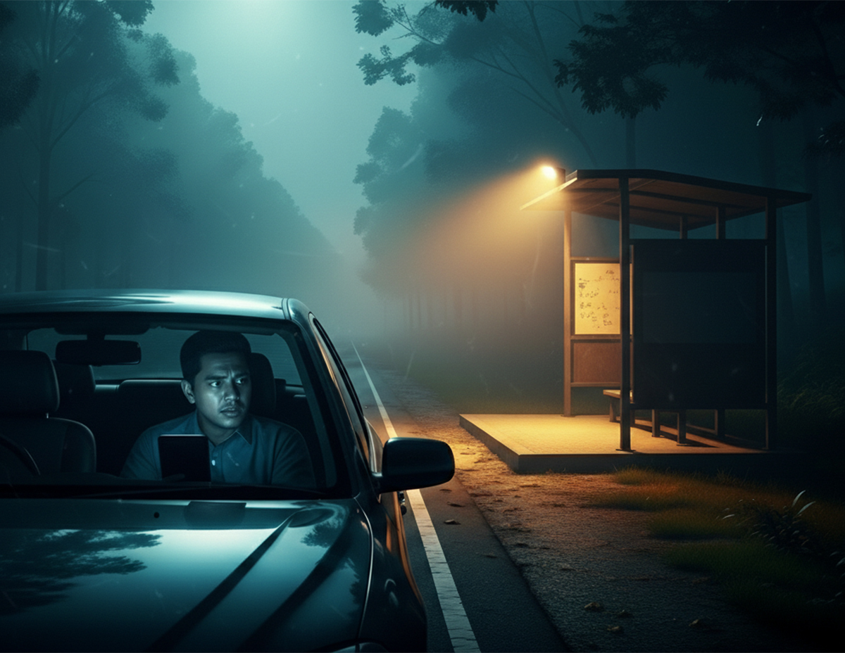 Perasaan bimbang mula menyelubungi minda kerana teringat akan cerita temannya tentang penunggu perhentian bas yang kerap mengganggu pengguna jalan raya terutama tiba waktu tengah malam.