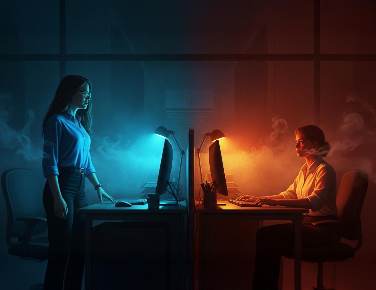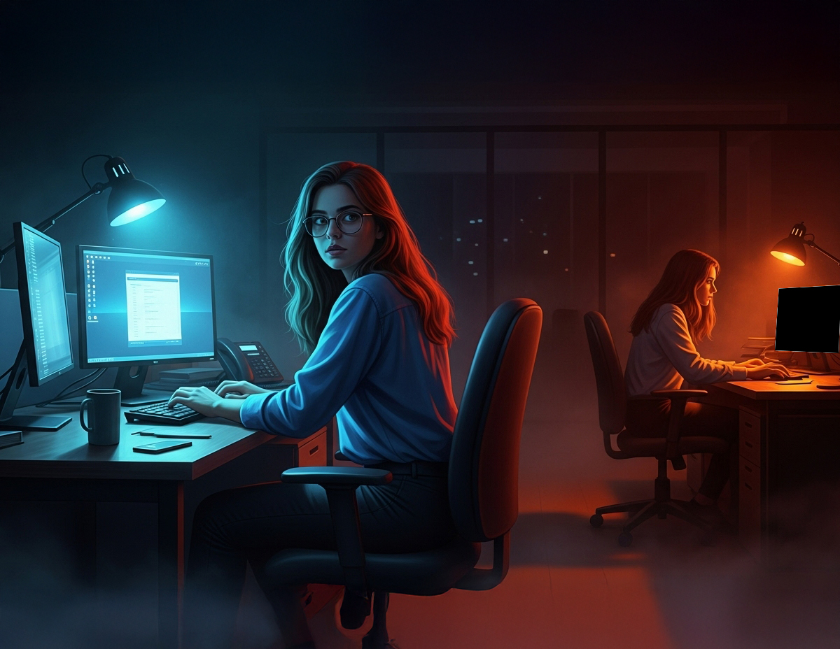 Semasa sedang fokus menyiapkan tugasan, sekitar pukul 9 malam, Aini melihat kelibat rakannya itu kembali ke pejabat dan duduk di meja sebelahnya.