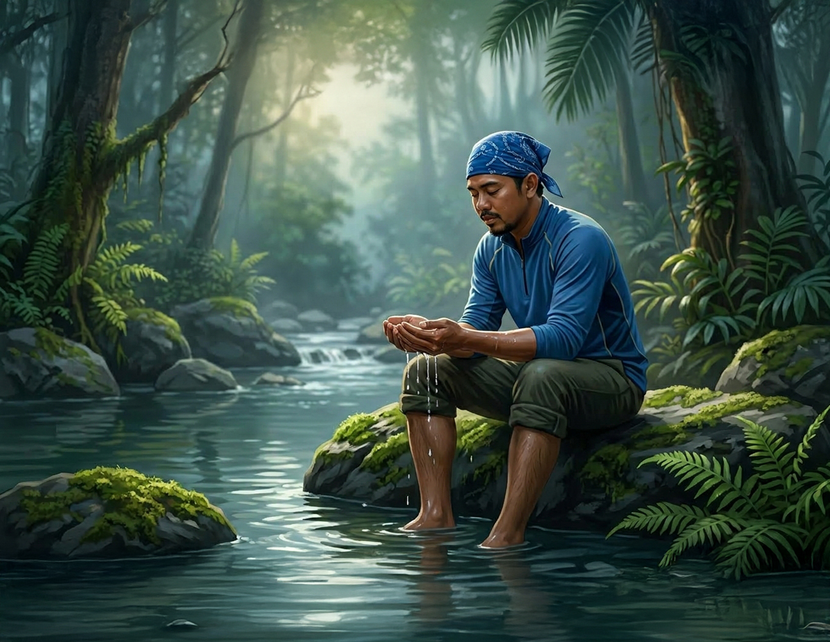 “Disebabkan kawasan di situ agak berbatu, saya bergerak ke kawasan atas kira-kira 20 meter dari tempat kami memancing mencari kawasan yang lebih sesuai dan selamat untuk mengambil wuduk dan mendirikan solat.