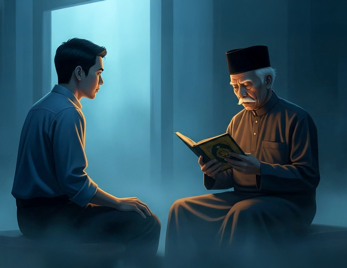 Afnan memaklumkan hal tersebut kepada ayah mertuanya yang ada di bilik bawah. Ayah mertuanya kemudian membaca beberapa ayat al-Quran.