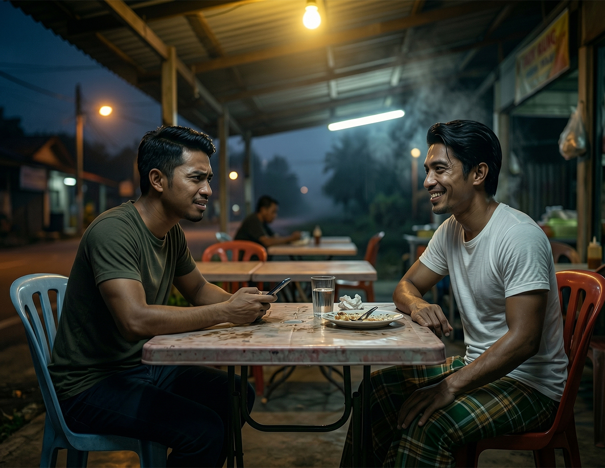 “Nantilah sembang beb. Aku hendak solat dulu, nanti habis pula waktu Maghrib,” sambungnya lagi sambil mencapai tuala di kerusi.