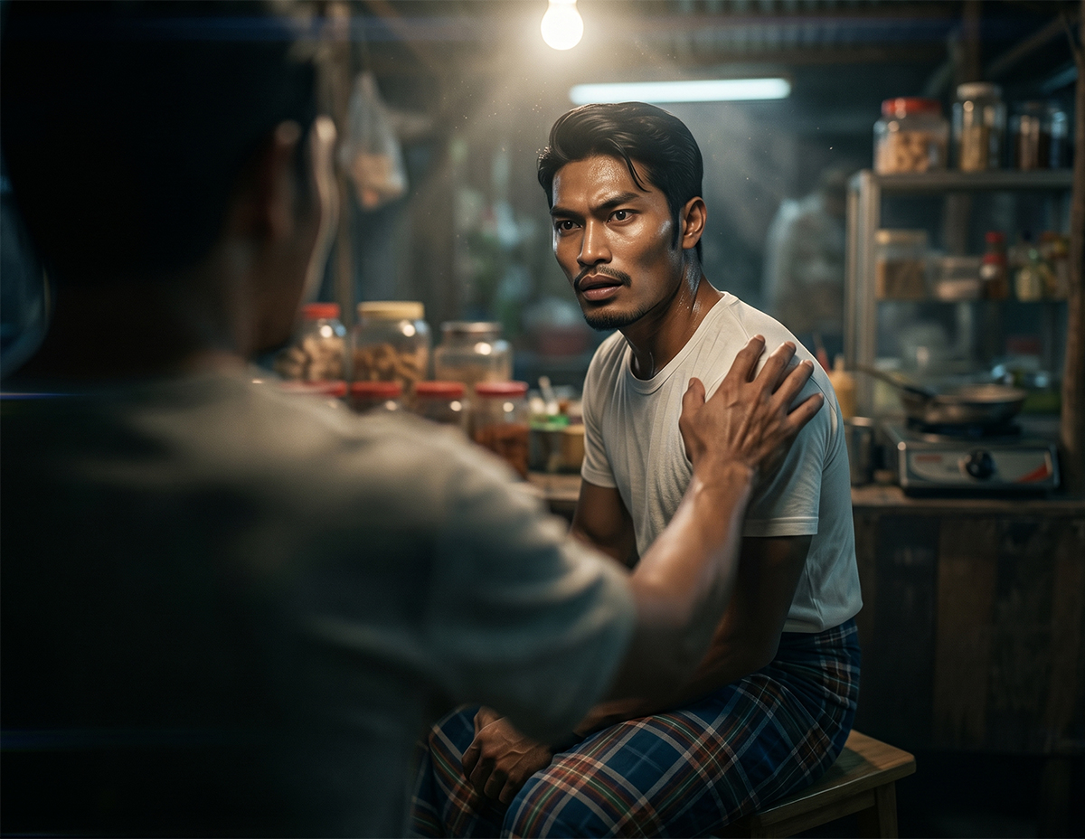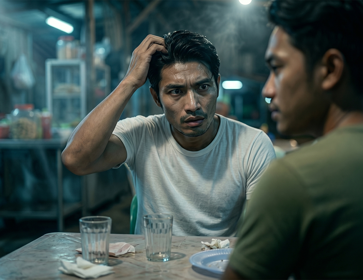 Sedang dia mengelamun sambil menunggu pesanan, tiba-tiba bahunya ditepuk dari belakang.